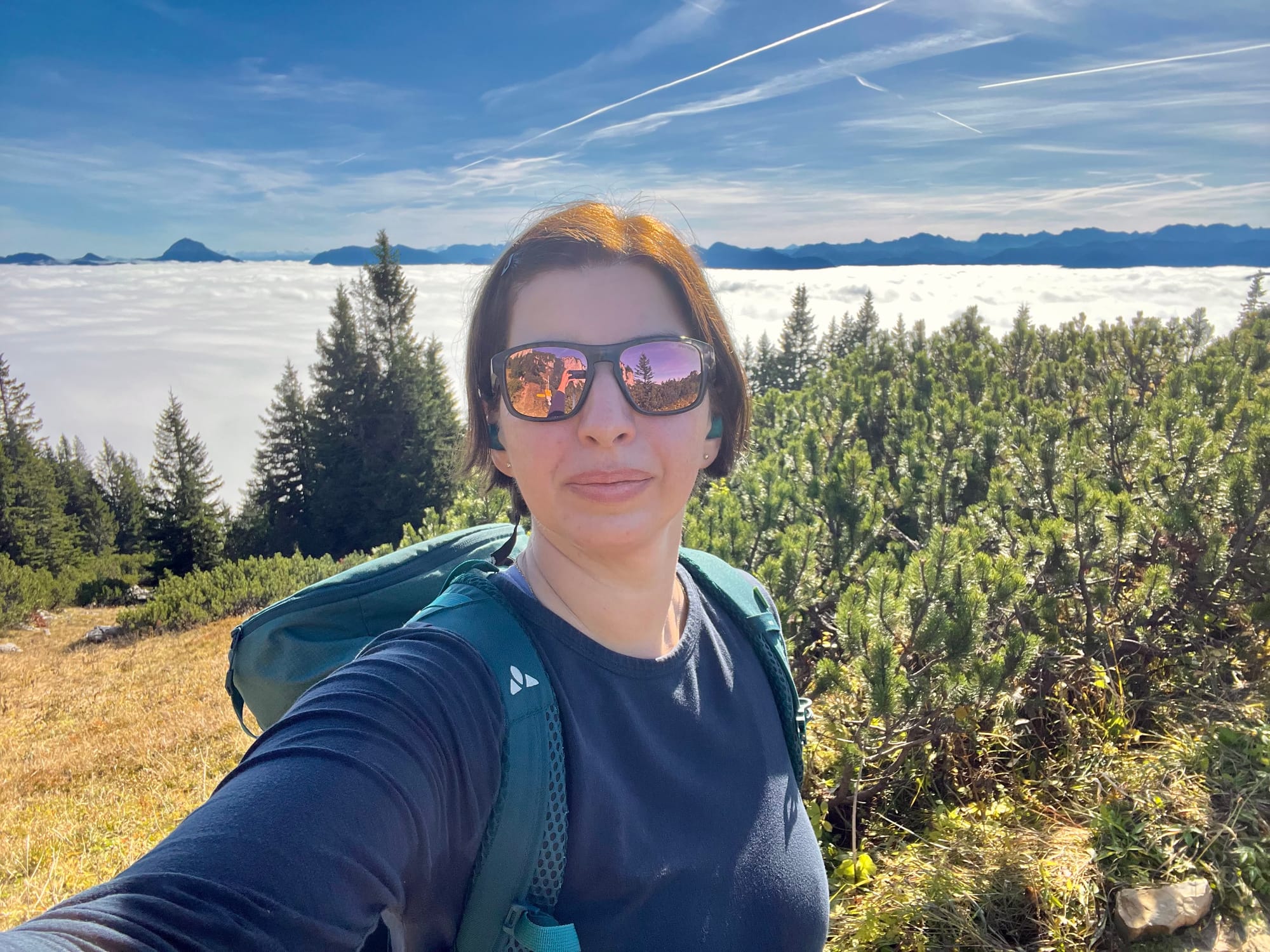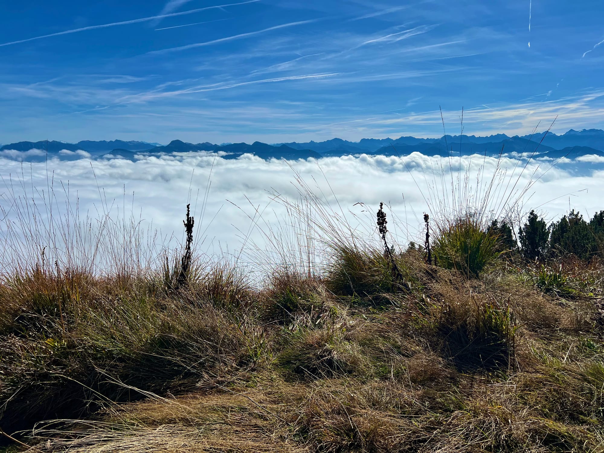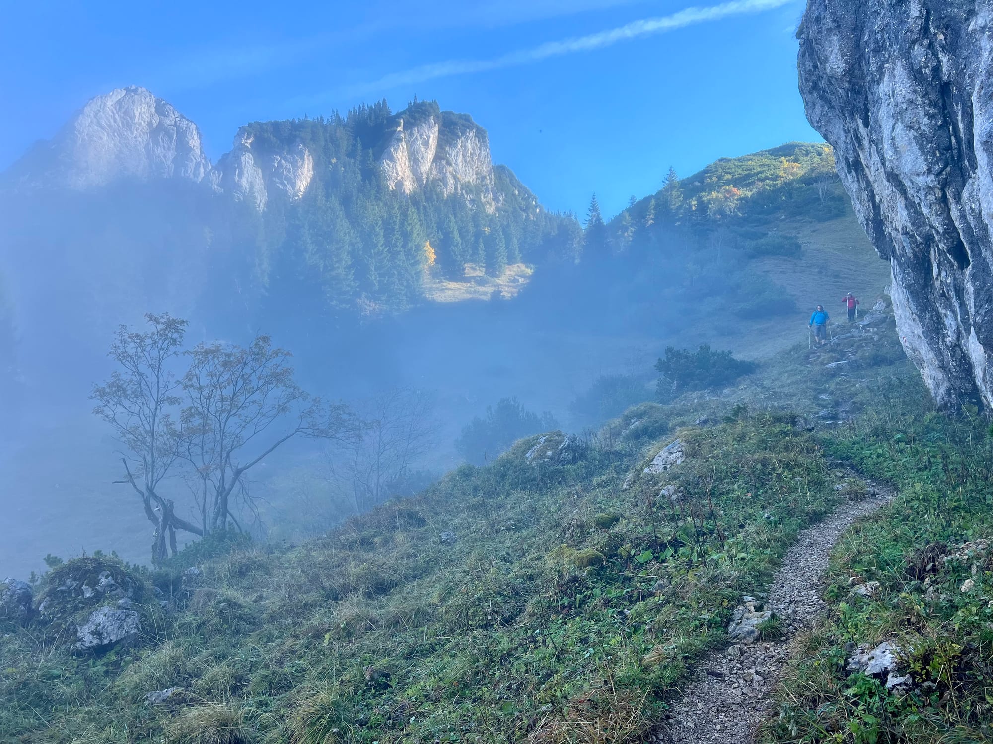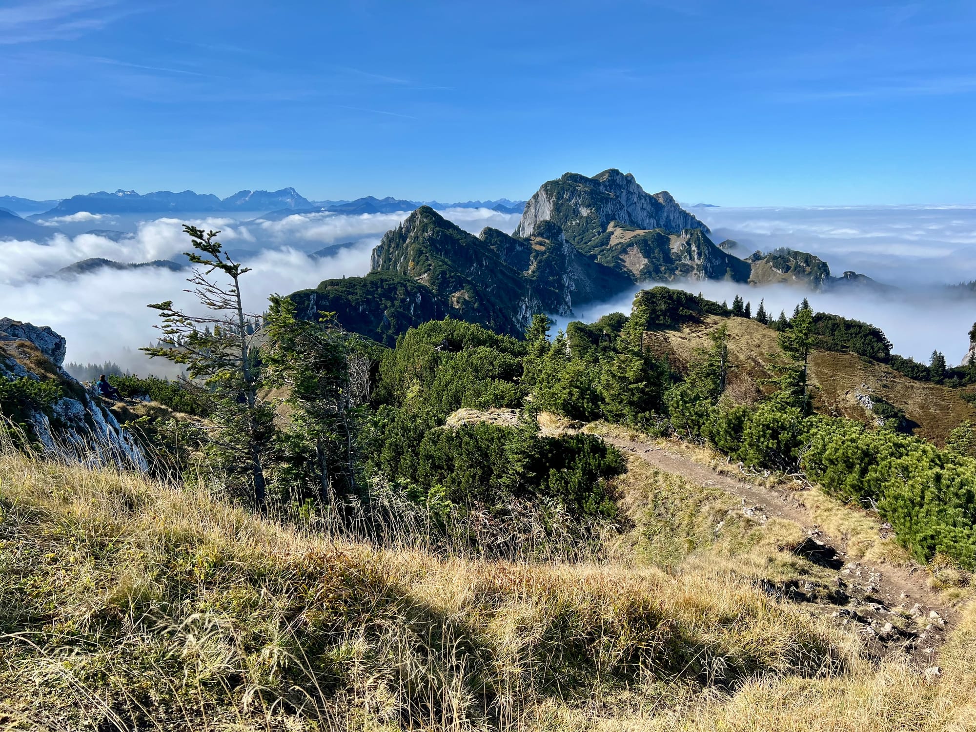 Doszłam na przełęcz i okazało się, że nad dolinami wiszą nisko chmury, a powyżej jest niebieski niebo. Przepiękny widok! Z jednej strony masyw Benediktwand, z drugiej droga grania w stronę Brauneck.