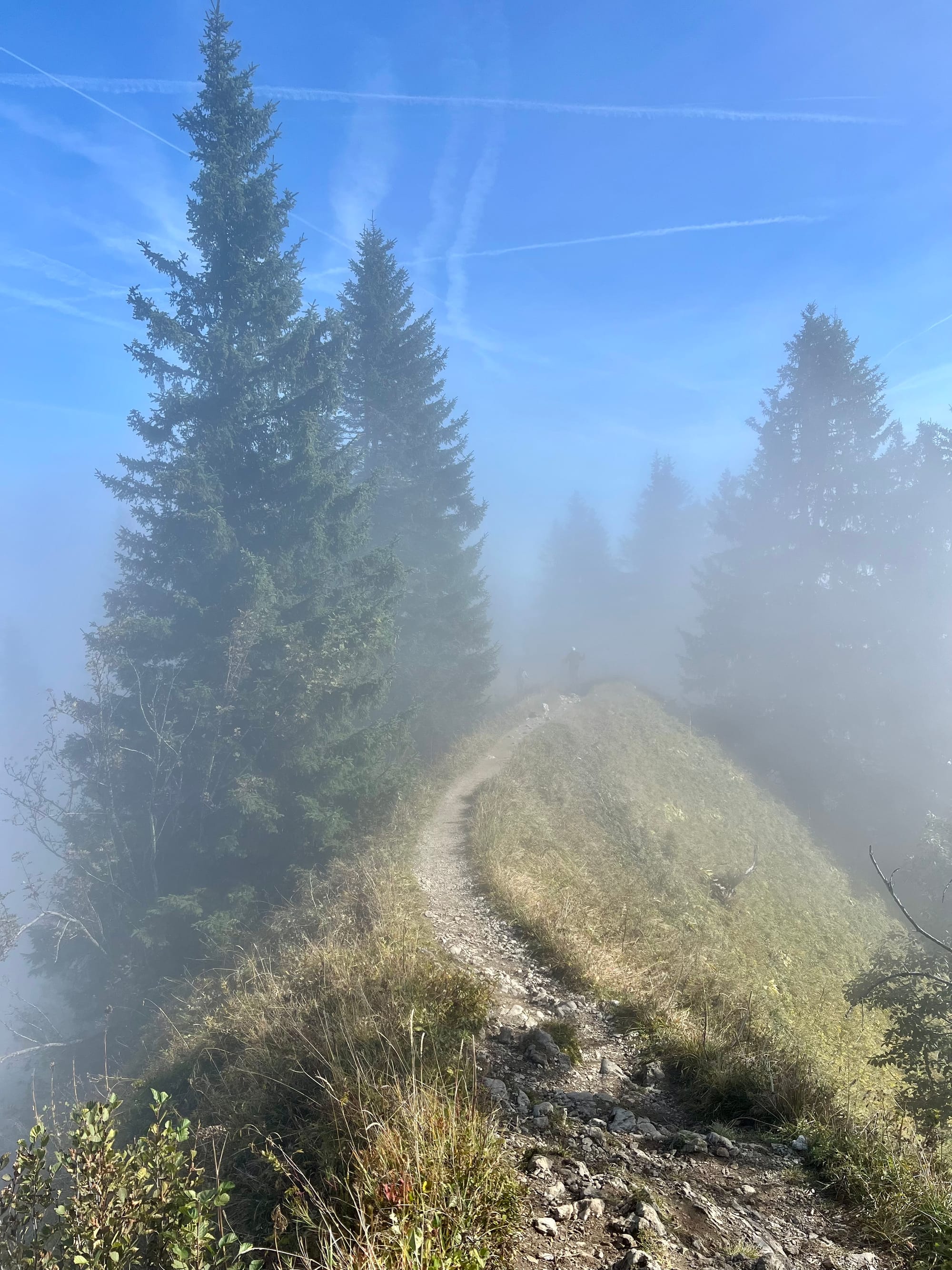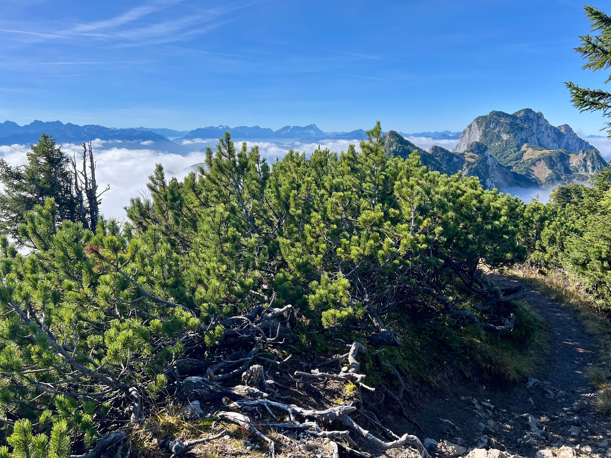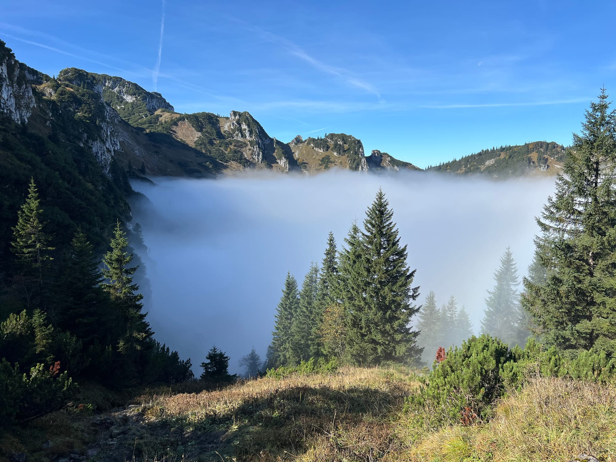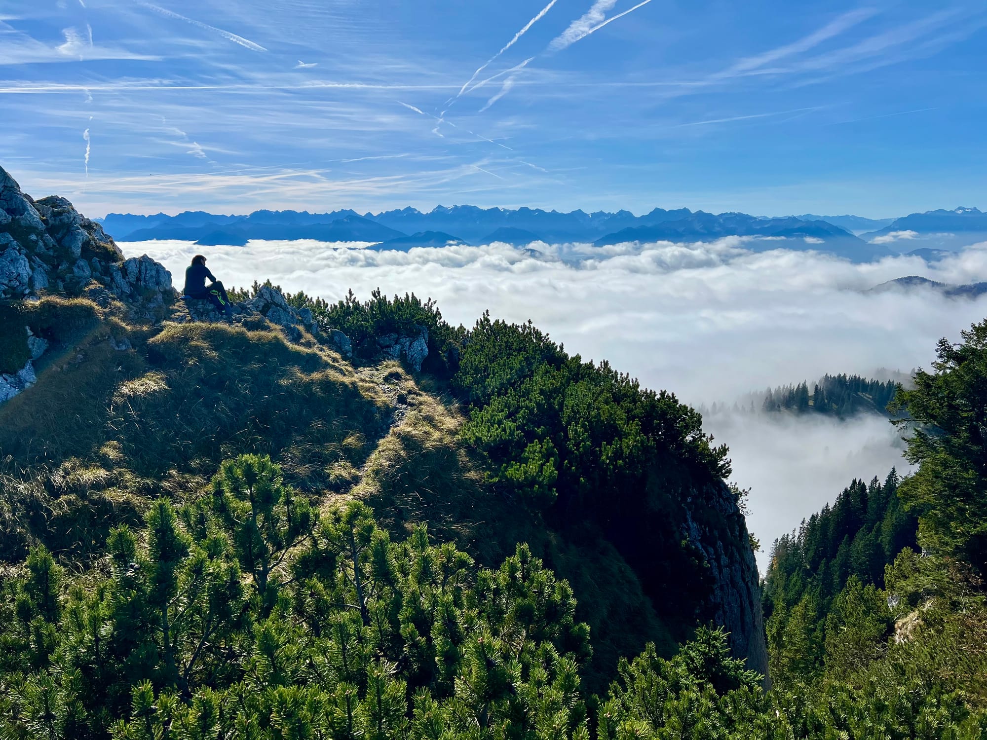 Doszłam na przełęcz i okazało się, że nad dolinami wiszą nisko chmury, a powyżej jest niebieski niebo. Przepiękny widok! Z jednej strony masyw Benediktwand, z drugiej droga grania w stronę Brauneck.