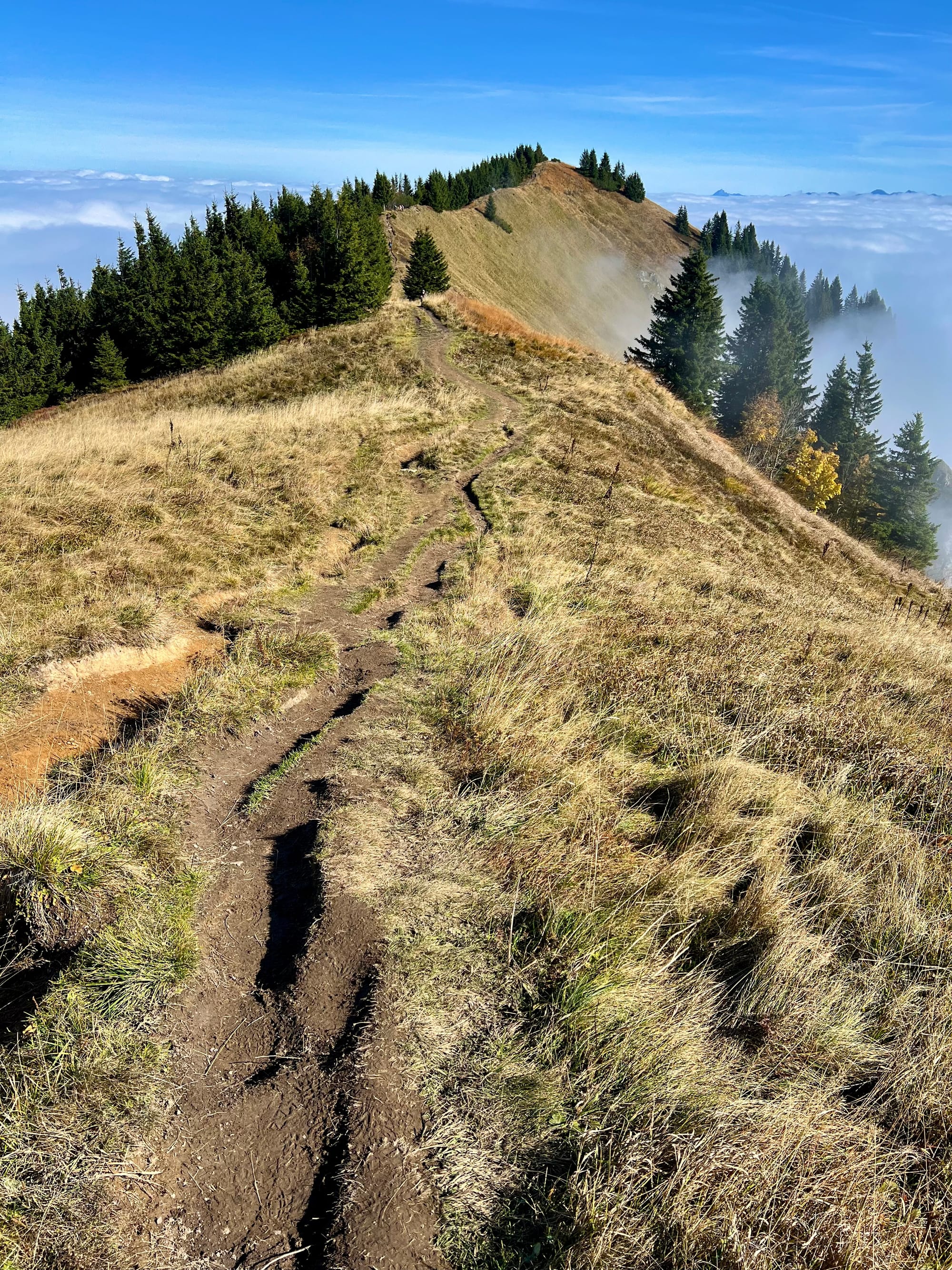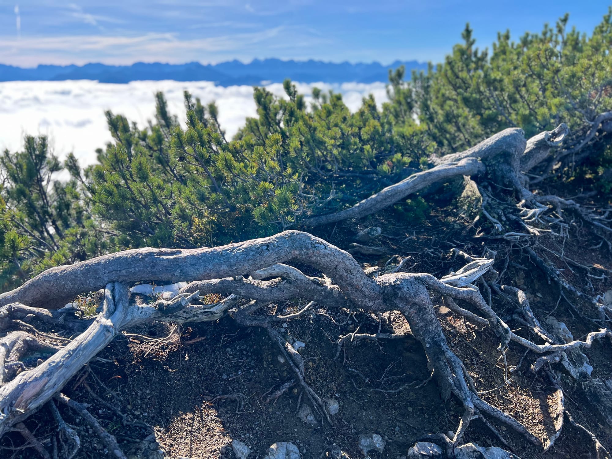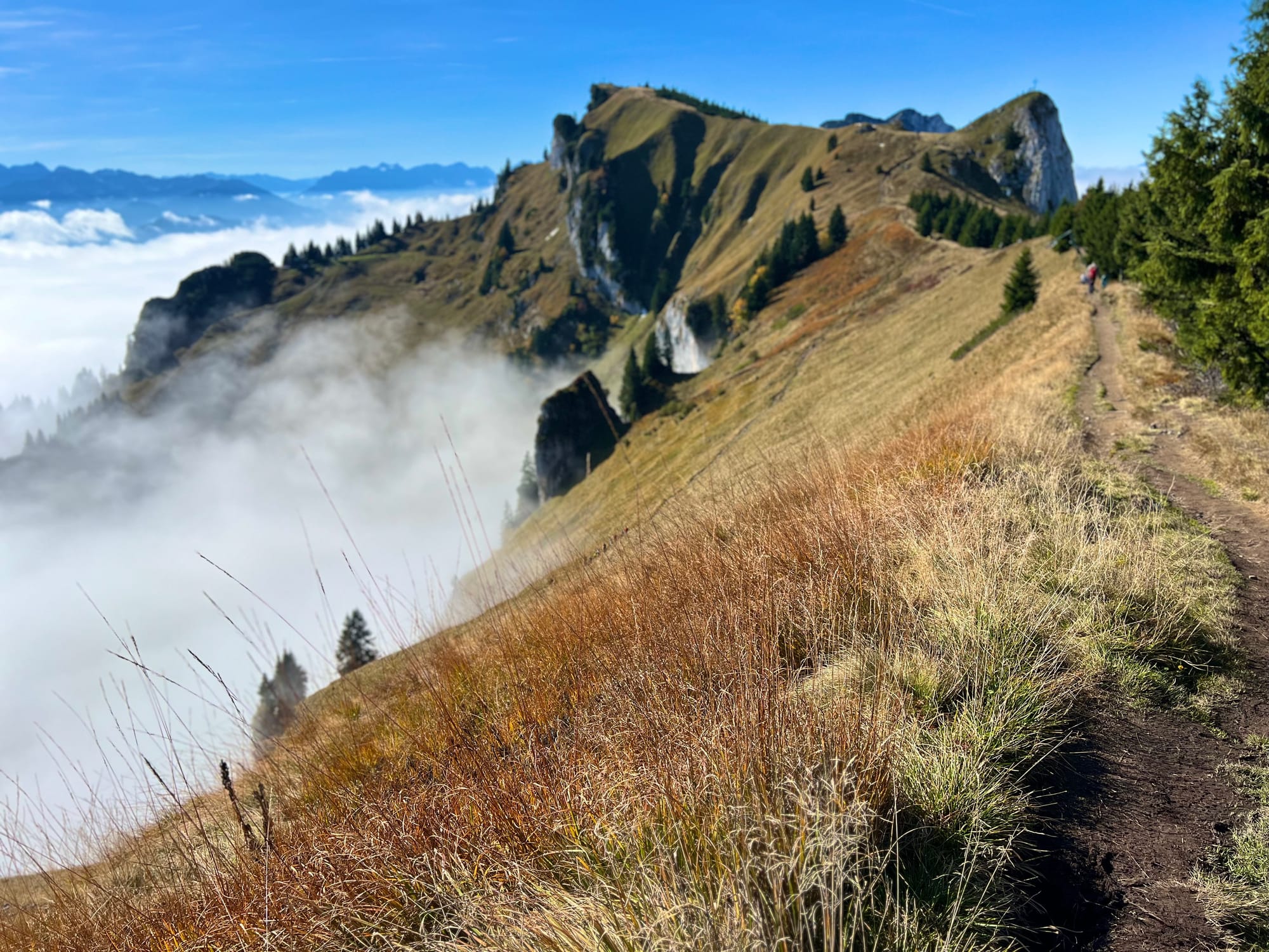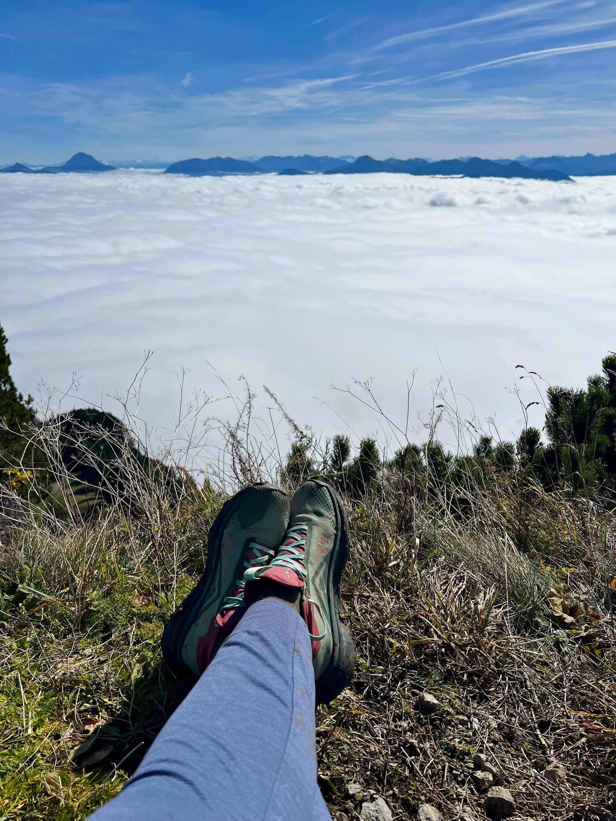 Doszłam na przełęcz i okazało się, że nad dolinami wiszą nisko chmury, a powyżej jest niebieski niebo. Przepiękny widok! Z jednej strony masyw Benediktwand, z drugiej droga grania w stronę Brauneck.