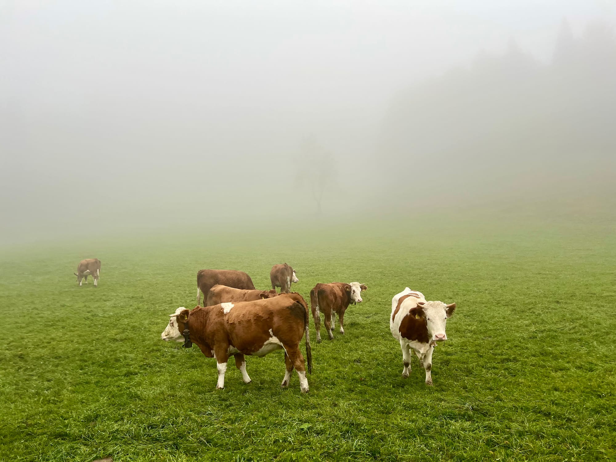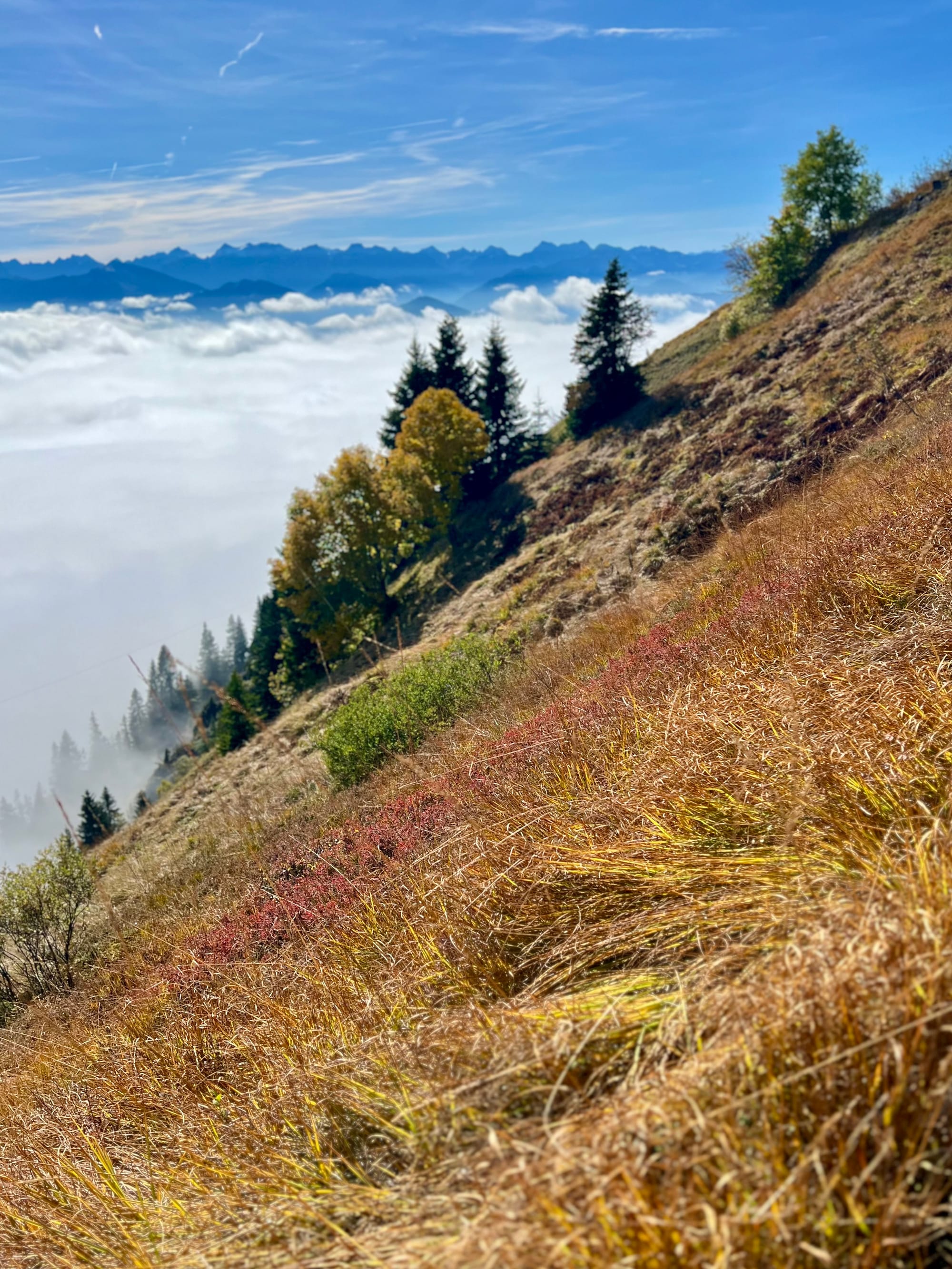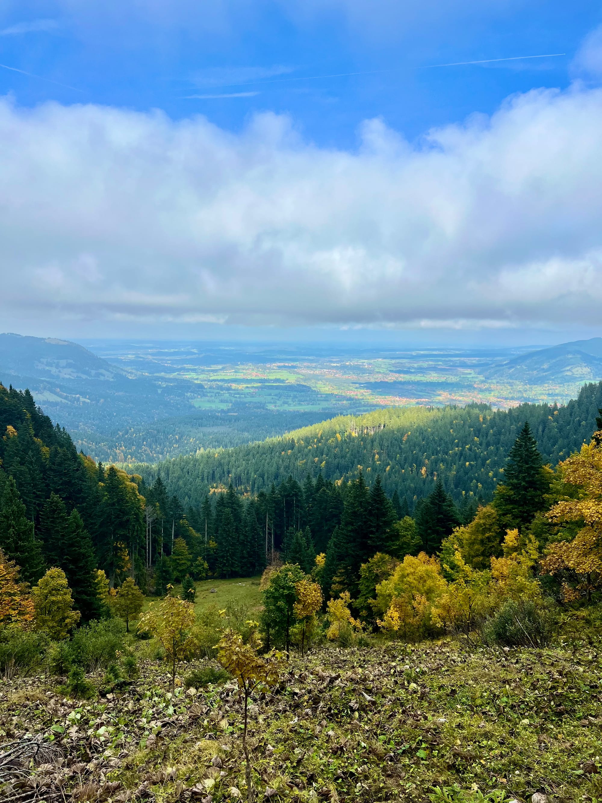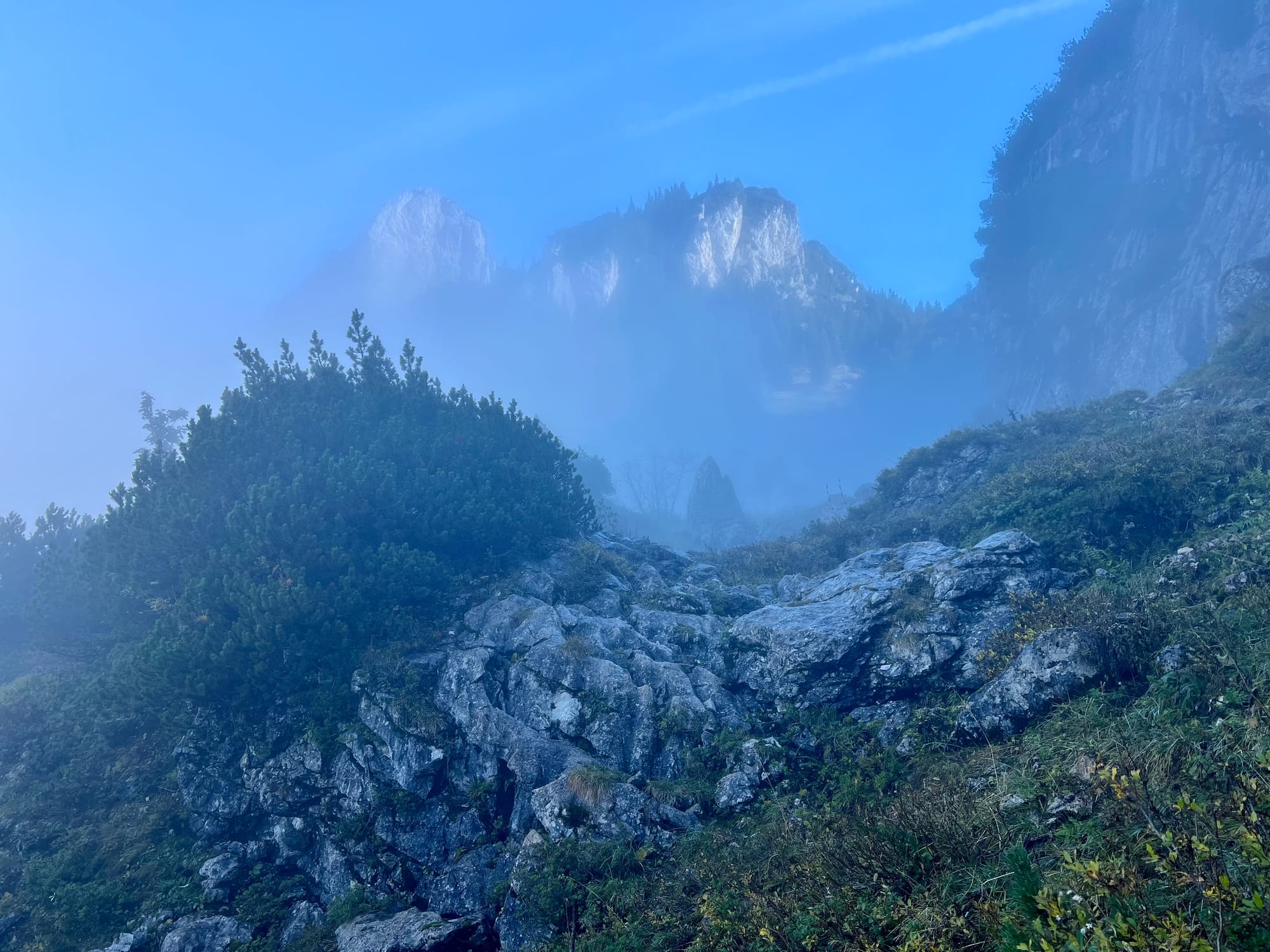 Doszłam na przełęcz i okazało się, że nad dolinami wiszą nisko chmury, a powyżej jest niebieski niebo. Przepiękny widok! Z jednej strony masyw Benediktwand, z drugiej droga grania w stronę Brauneck.