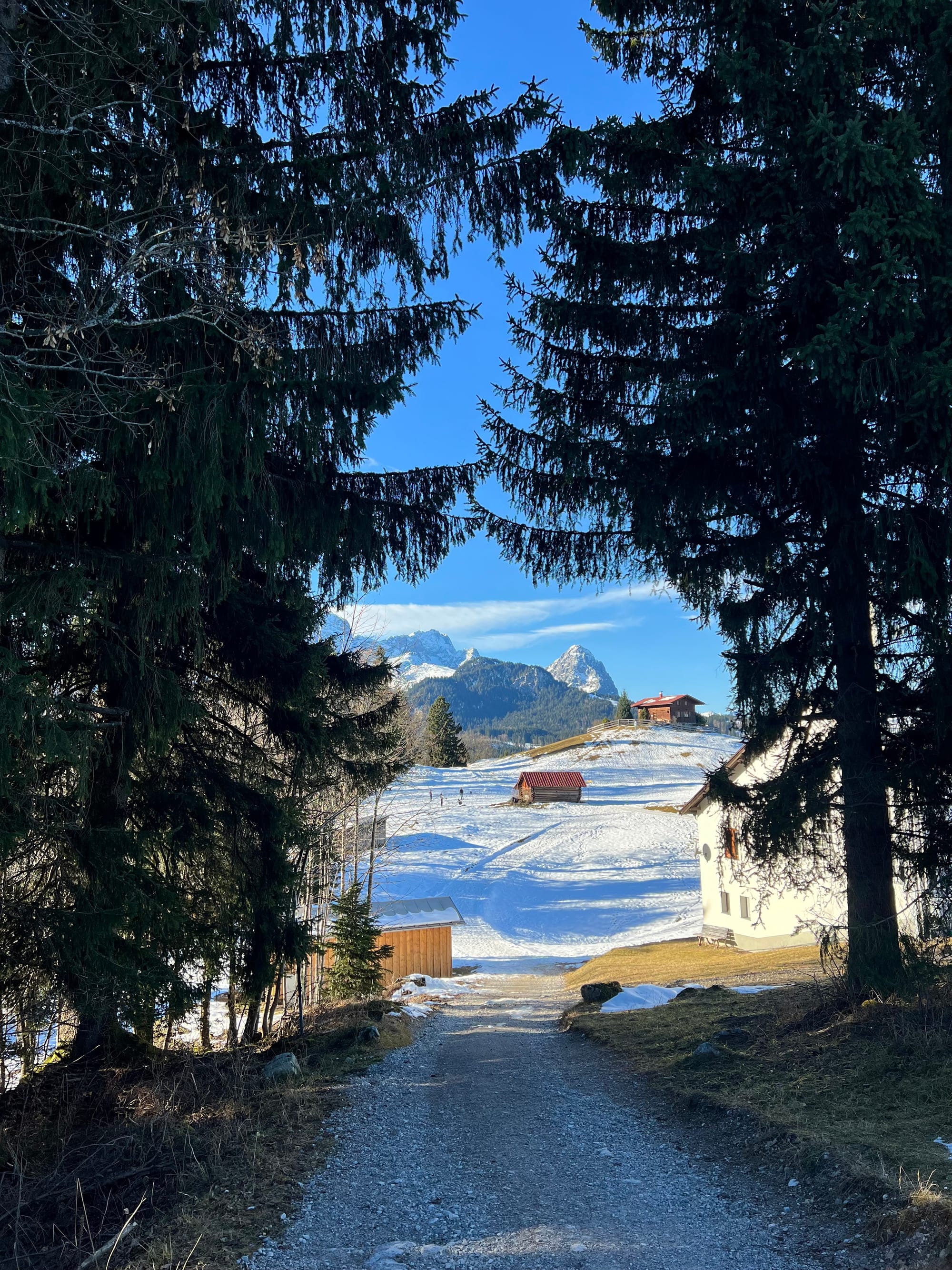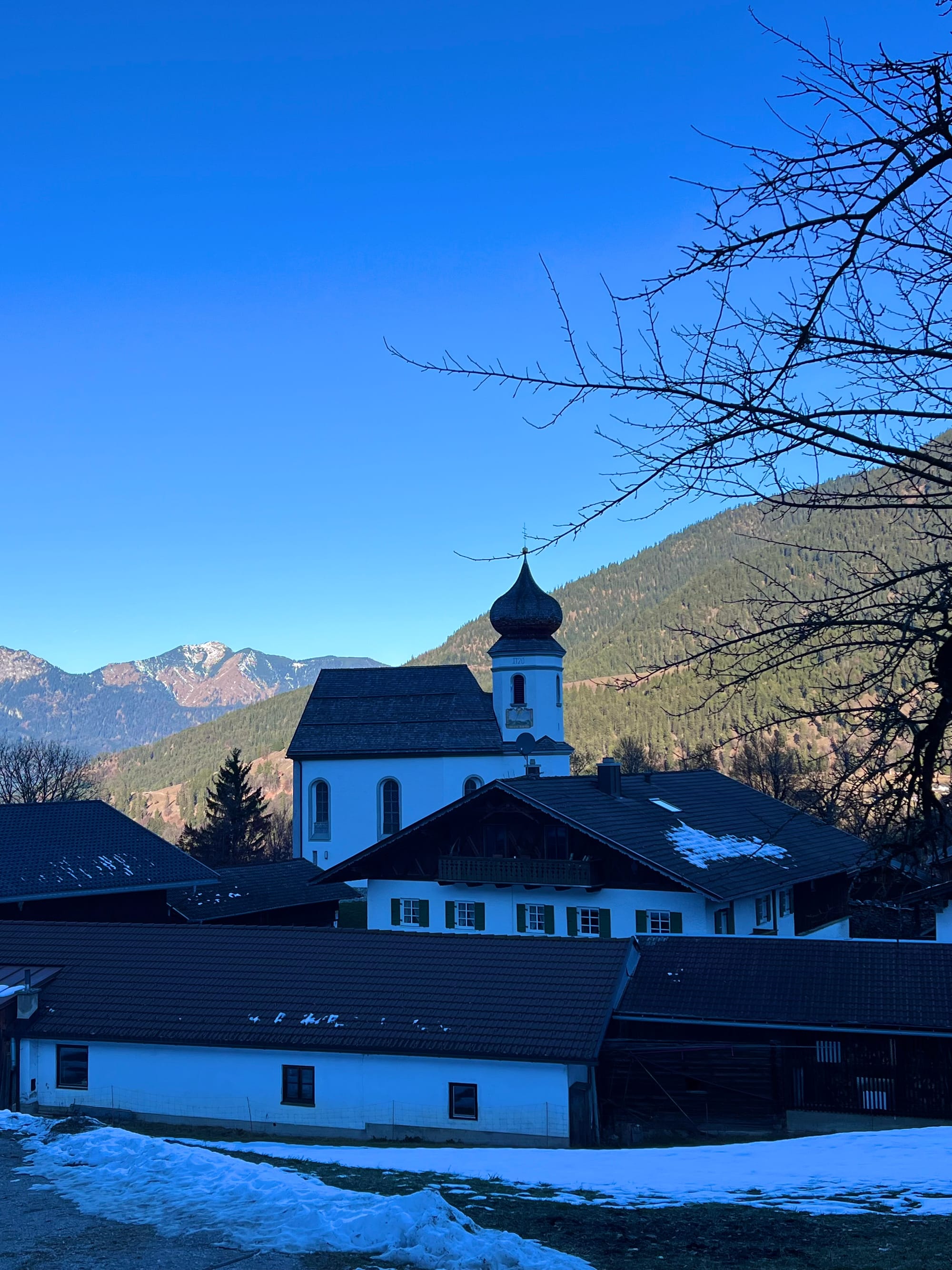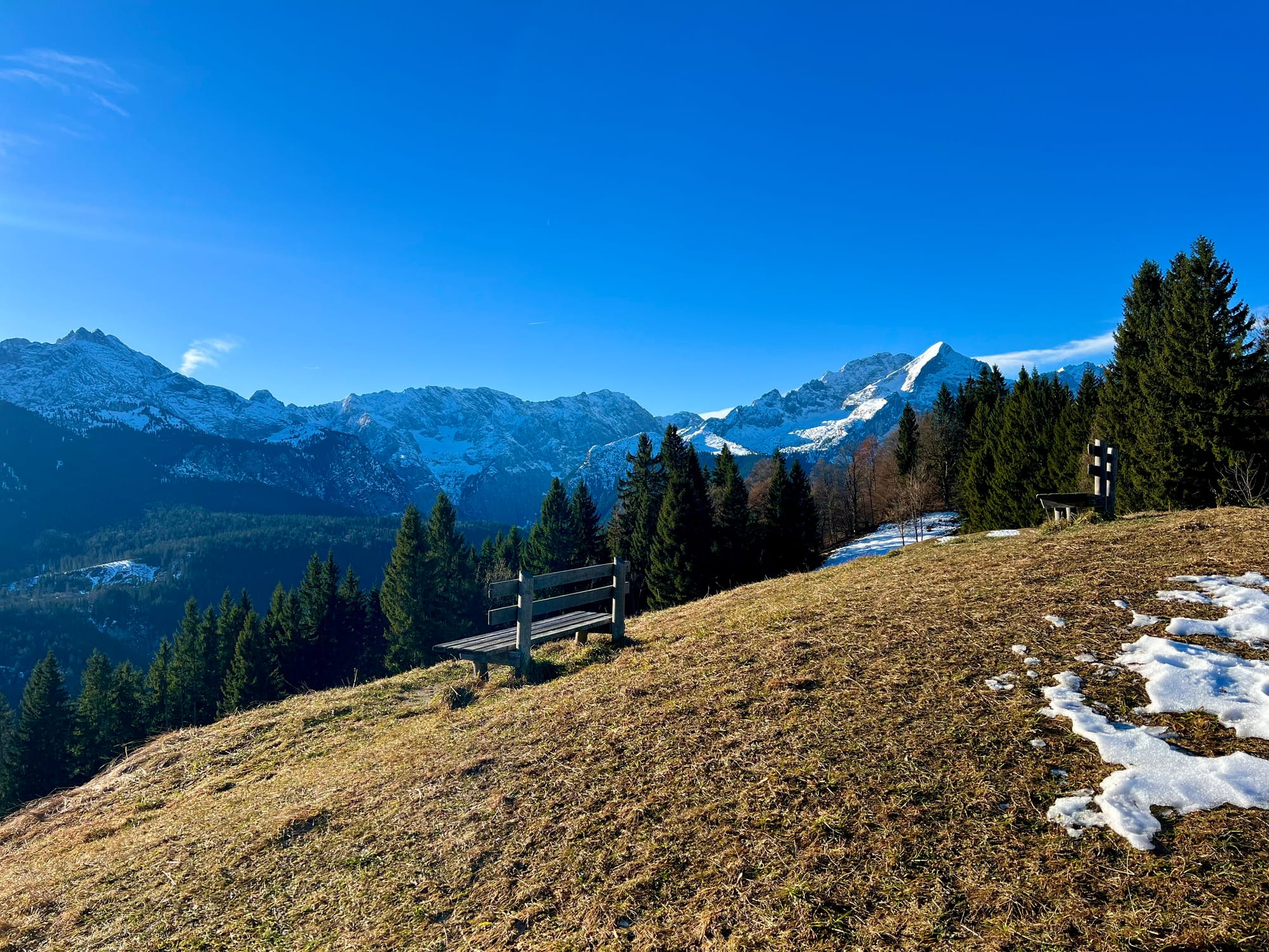 Jeden przystanek zrobiłam sobie pod kościółkiem w Wamberg, na śniadanie. Później chwilkę się idzie i zaczyna być widać przepiękną panoramę Alp. Można usiąść na ławeczce, wygrzewać się w słońcu i po prostu patrzeć. Uwielbiam to miejsce!