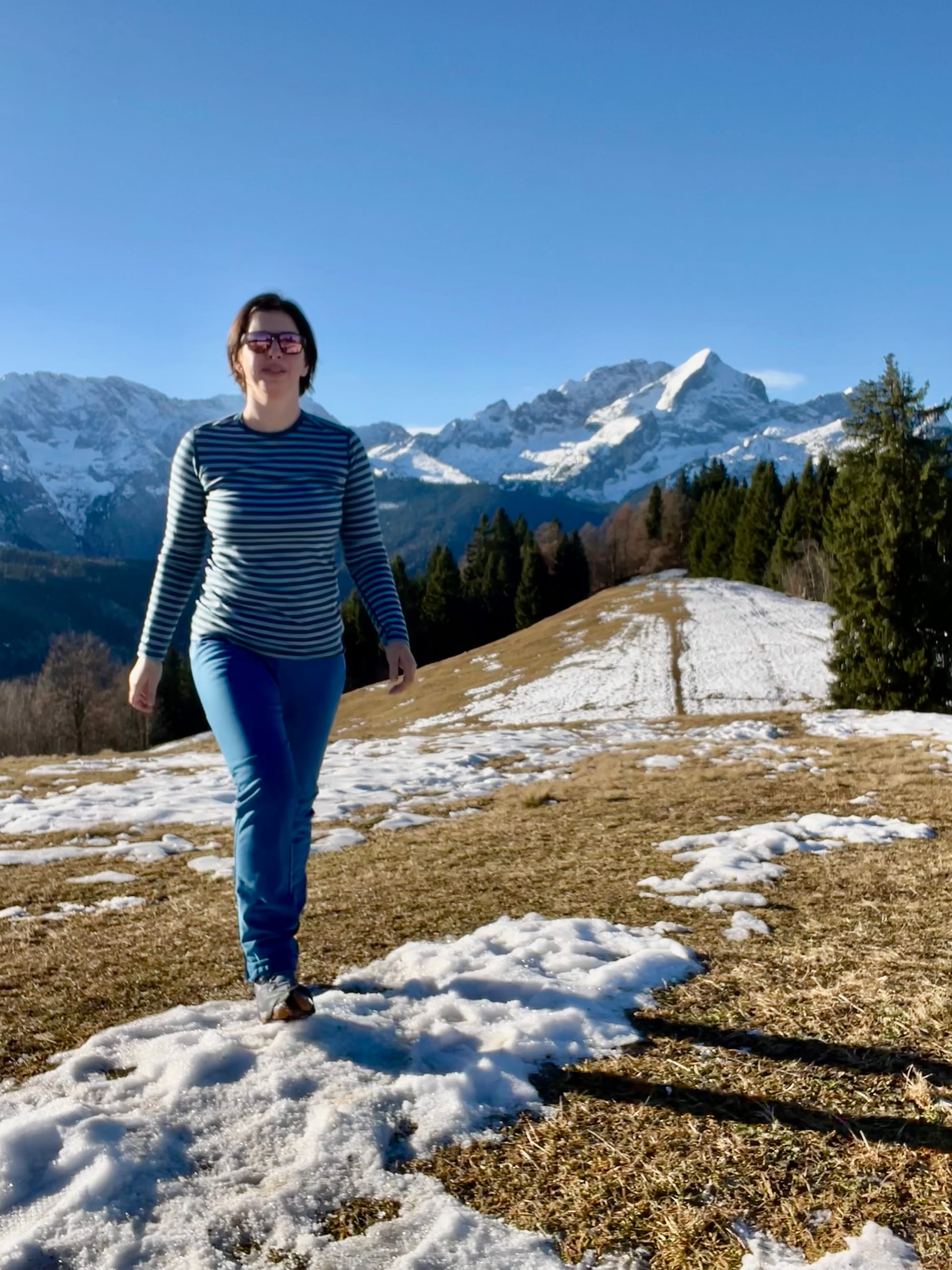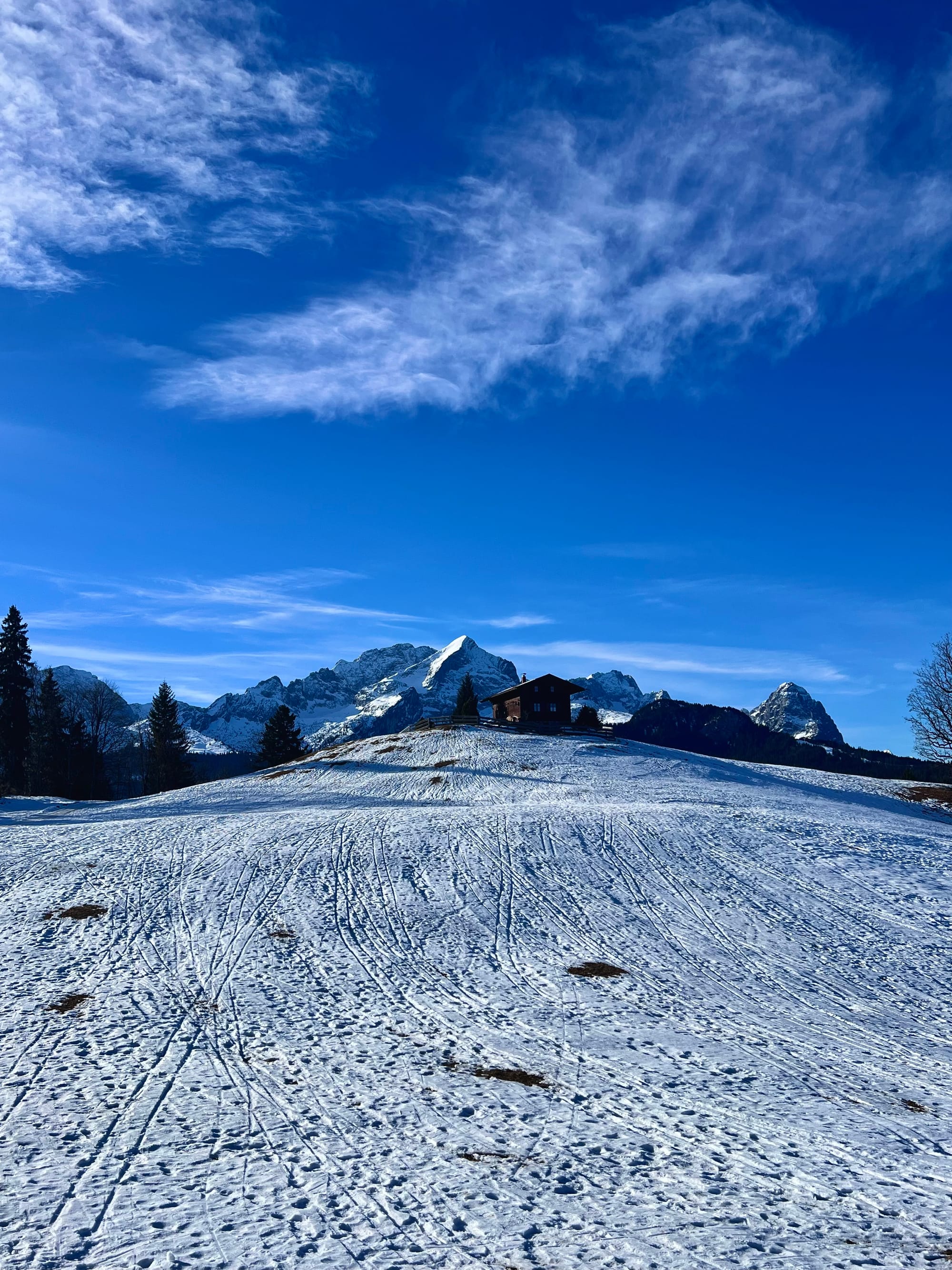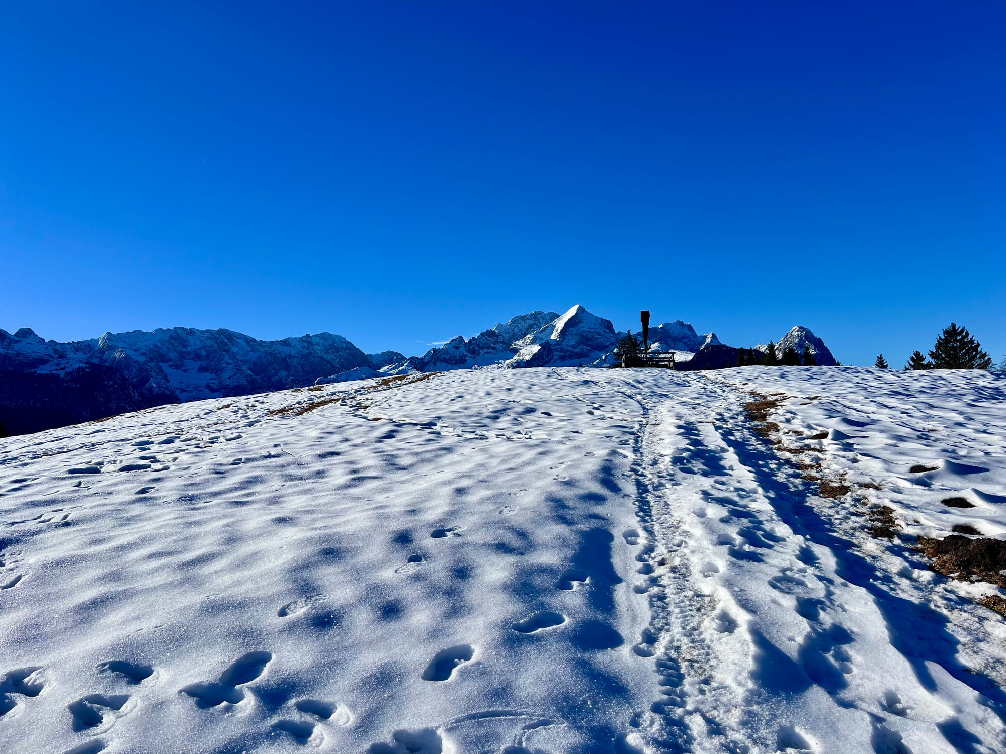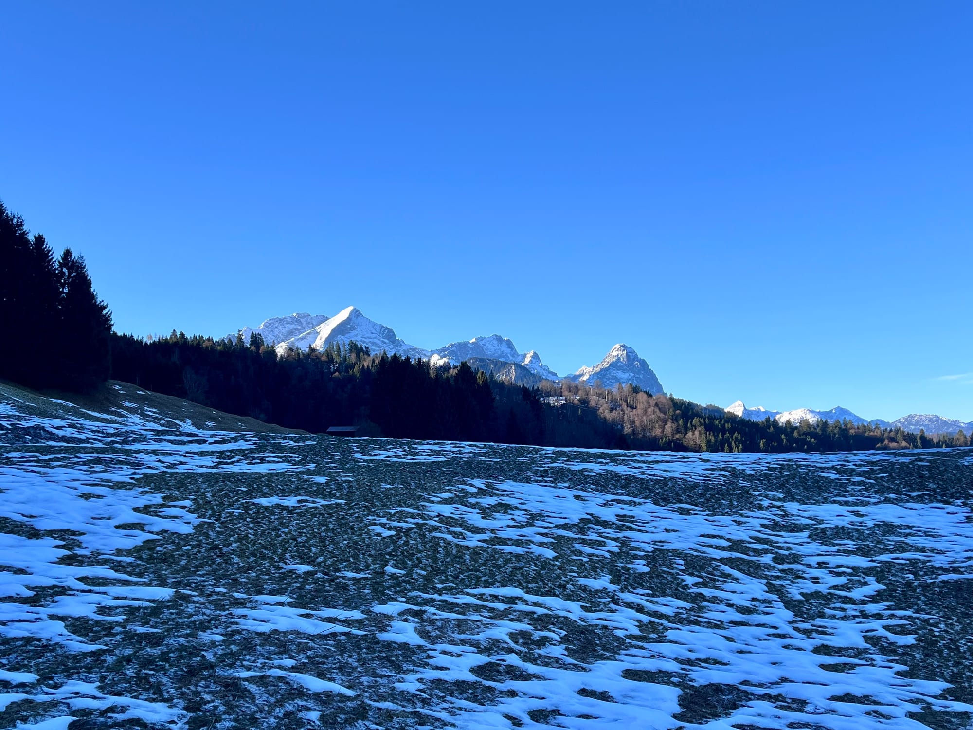 Jeden przystanek zrobiłam sobie pod kościółkiem w Wamberg, na śniadanie. Później chwilkę się idzie i zaczyna być widać przepiękną panoramę Alp. Można usiąść na ławeczce, wygrzewać się w słońcu i po prostu patrzeć. Uwielbiam to miejsce!