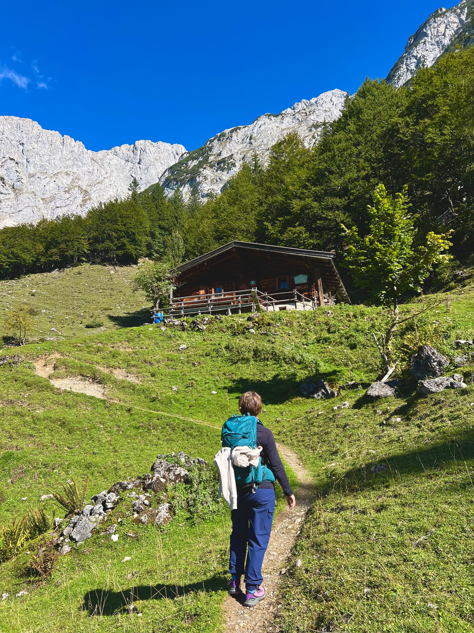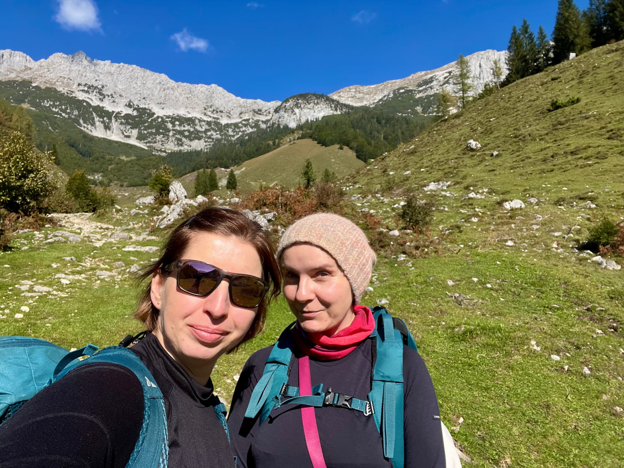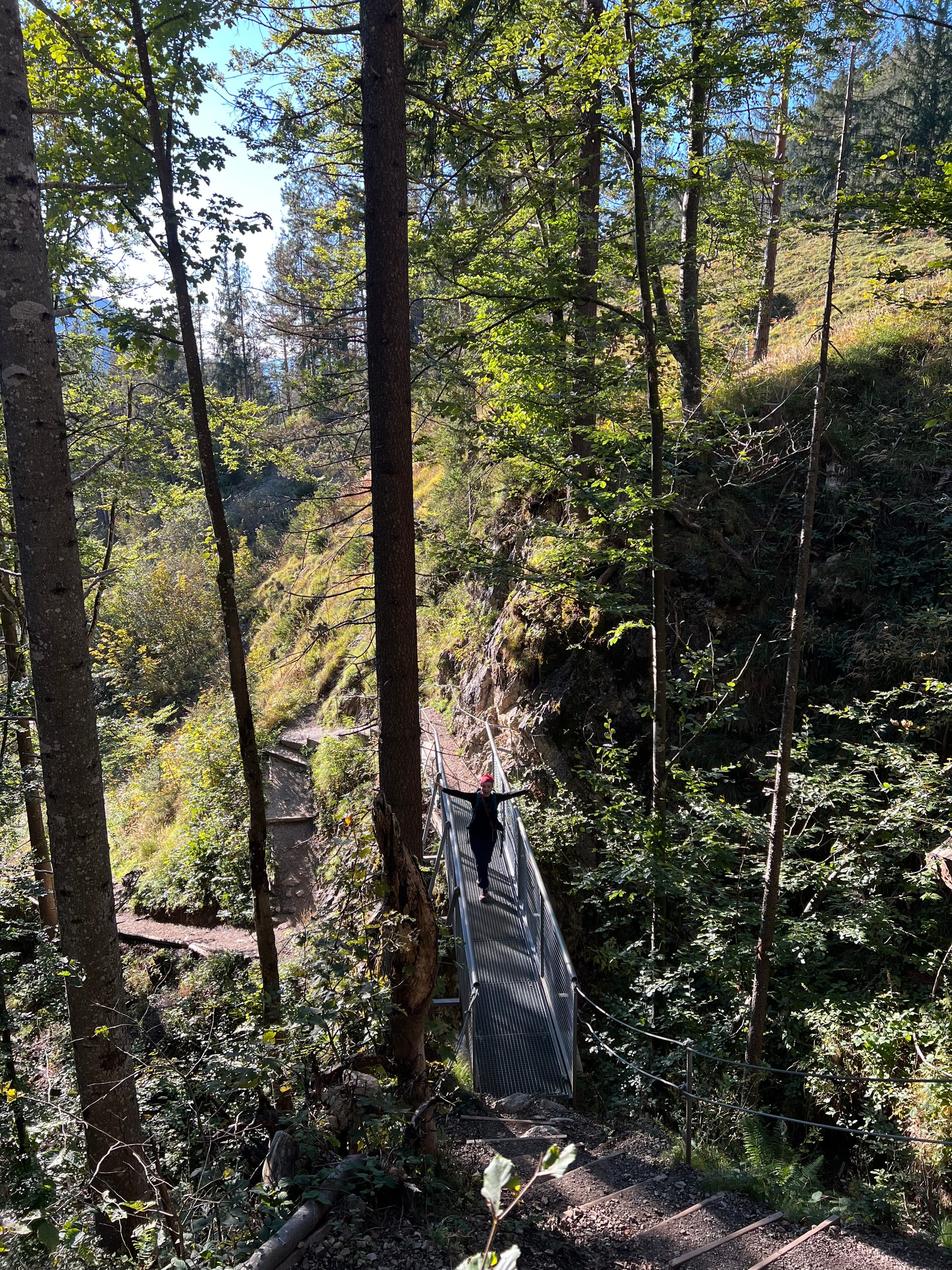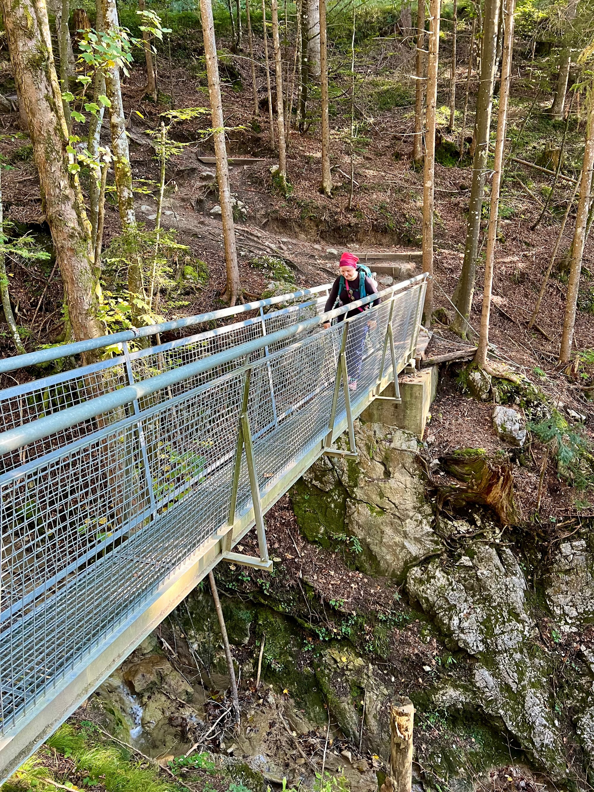 Na początku kawa w bardzo przytulnej, tyrolskiej kawiarence. A później już trzeba było się zbierać i po prostu iść w górę. Startowałyśmy z Scheffau am Widem Kaiser i jest to niesamowite miejsce, bo już z dołu, z wioski widać ogromne ściany skalne. Najpierw trochę szłyśmy przez las, a nawet wąwóz i tam było już widać jesień. Temperatura też nie za wysoka, ale jak się idzie pod górkę z plecakiem, to szybko można się rozgrzać.
