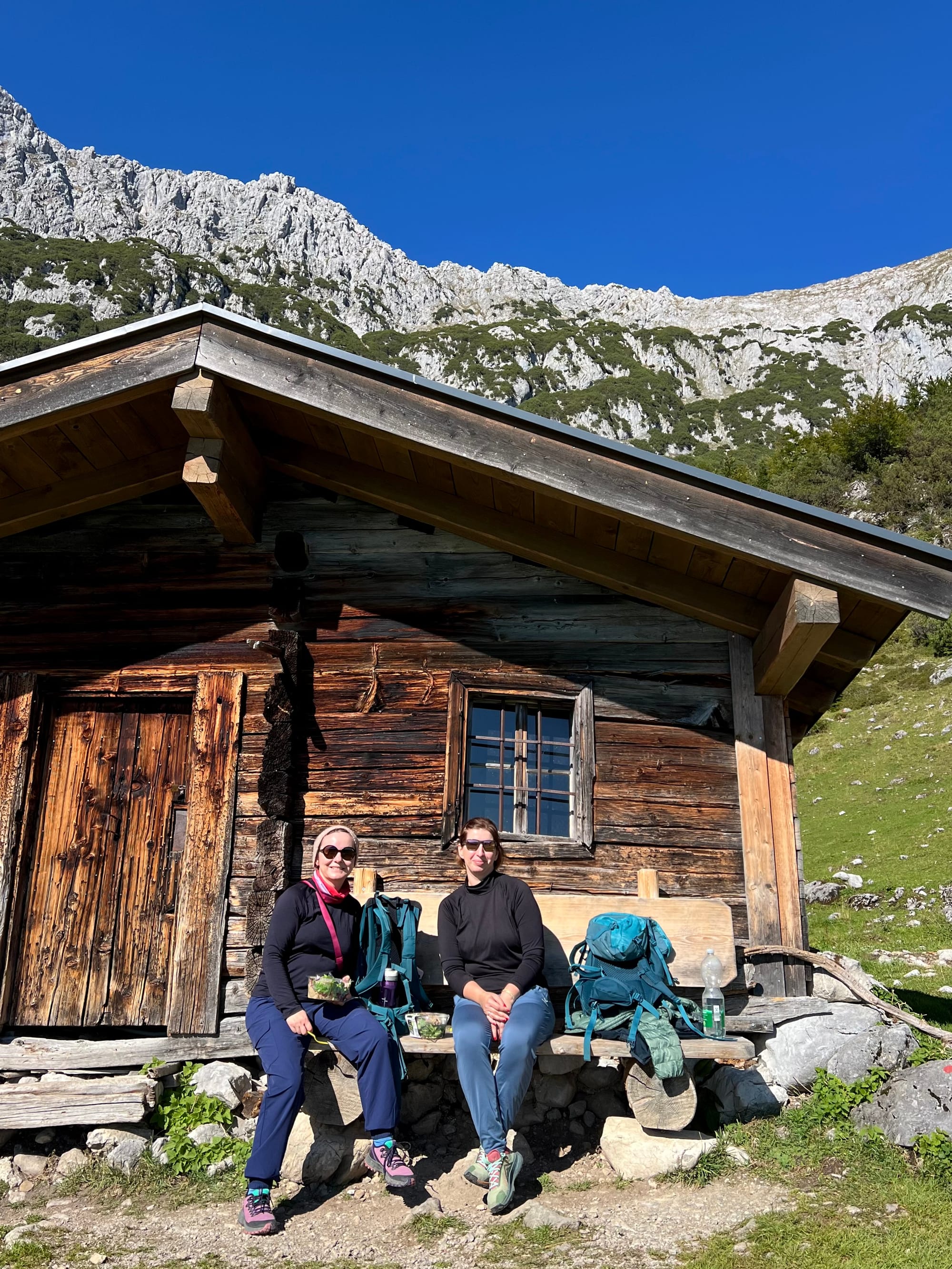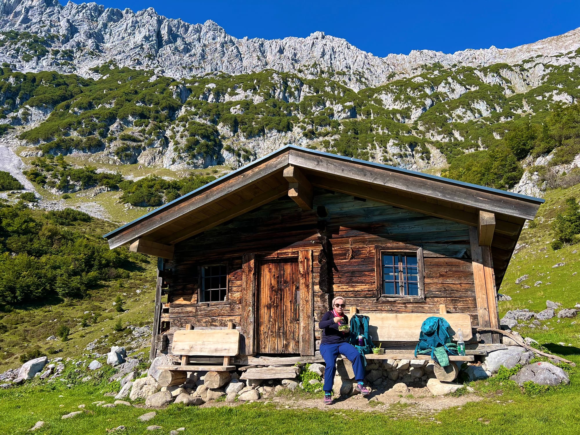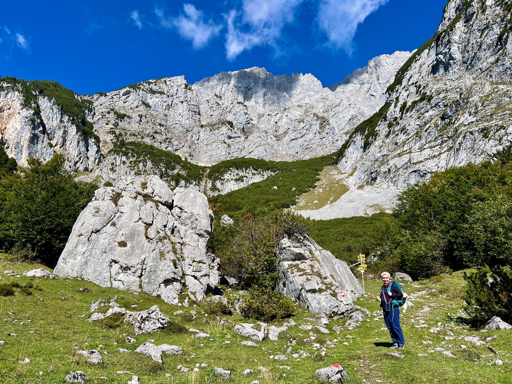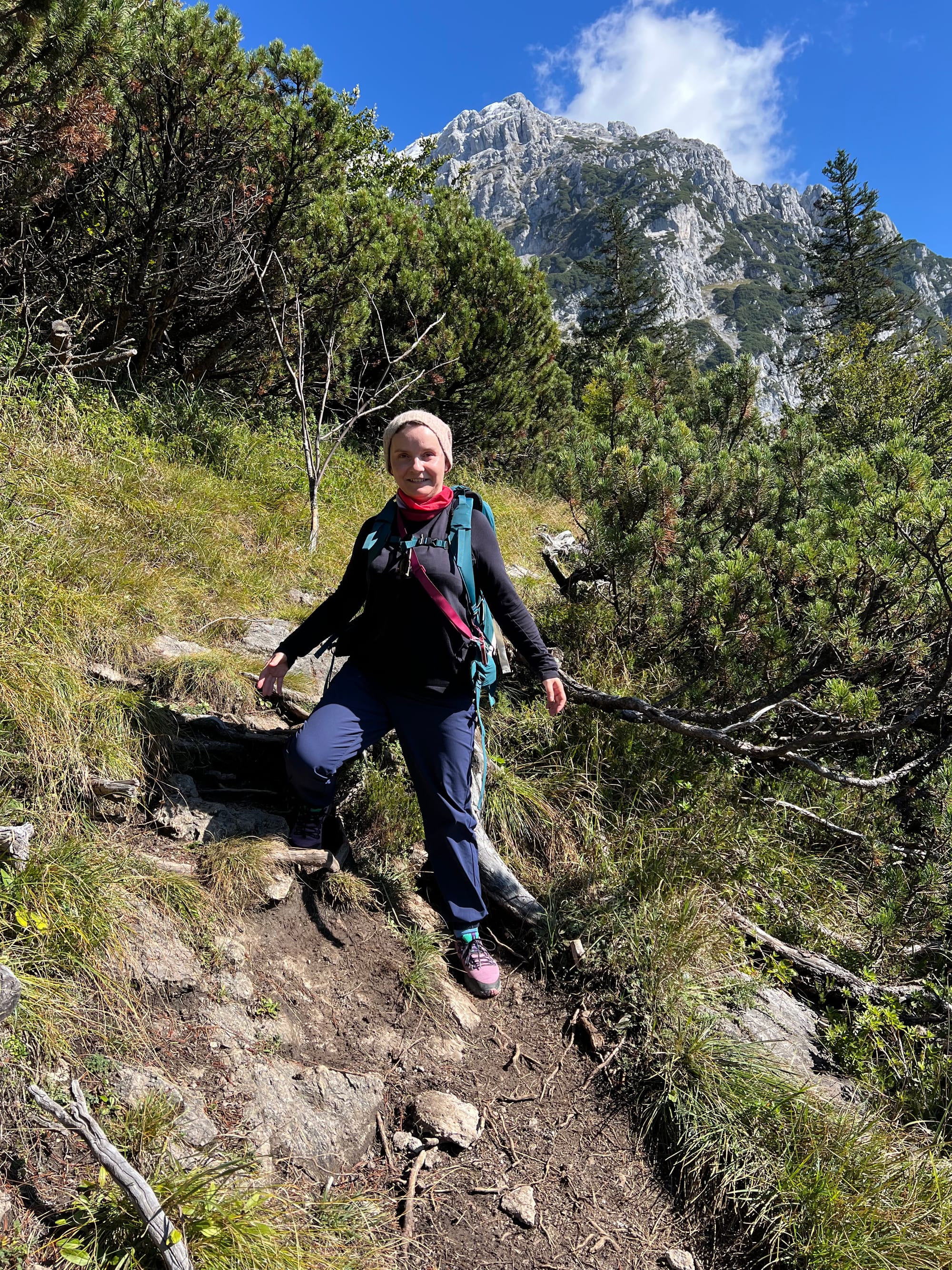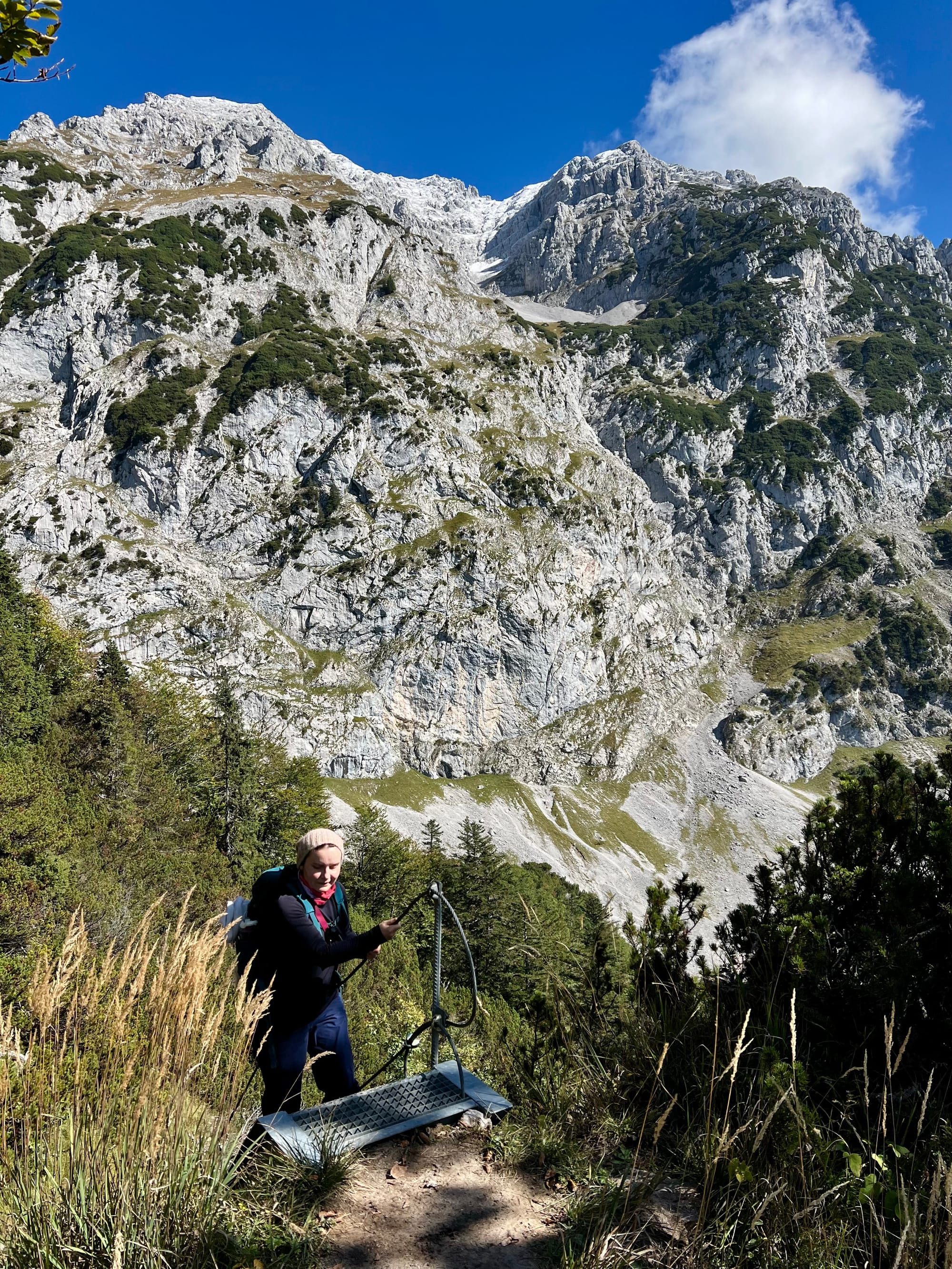 Na początku kawa w bardzo przytulnej, tyrolskiej kawiarence. A później już trzeba było się zbierać i po prostu iść w górę. Startowałyśmy z Scheffau am Widem Kaiser i jest to niesamowite miejsce, bo już z dołu, z wioski widać ogromne ściany skalne. Najpierw trochę szłyśmy przez las, a nawet wąwóz i tam było już widać jesień. Temperatura też nie za wysoka, ale jak się idzie pod górkę z plecakiem, to szybko można się rozgrzać.