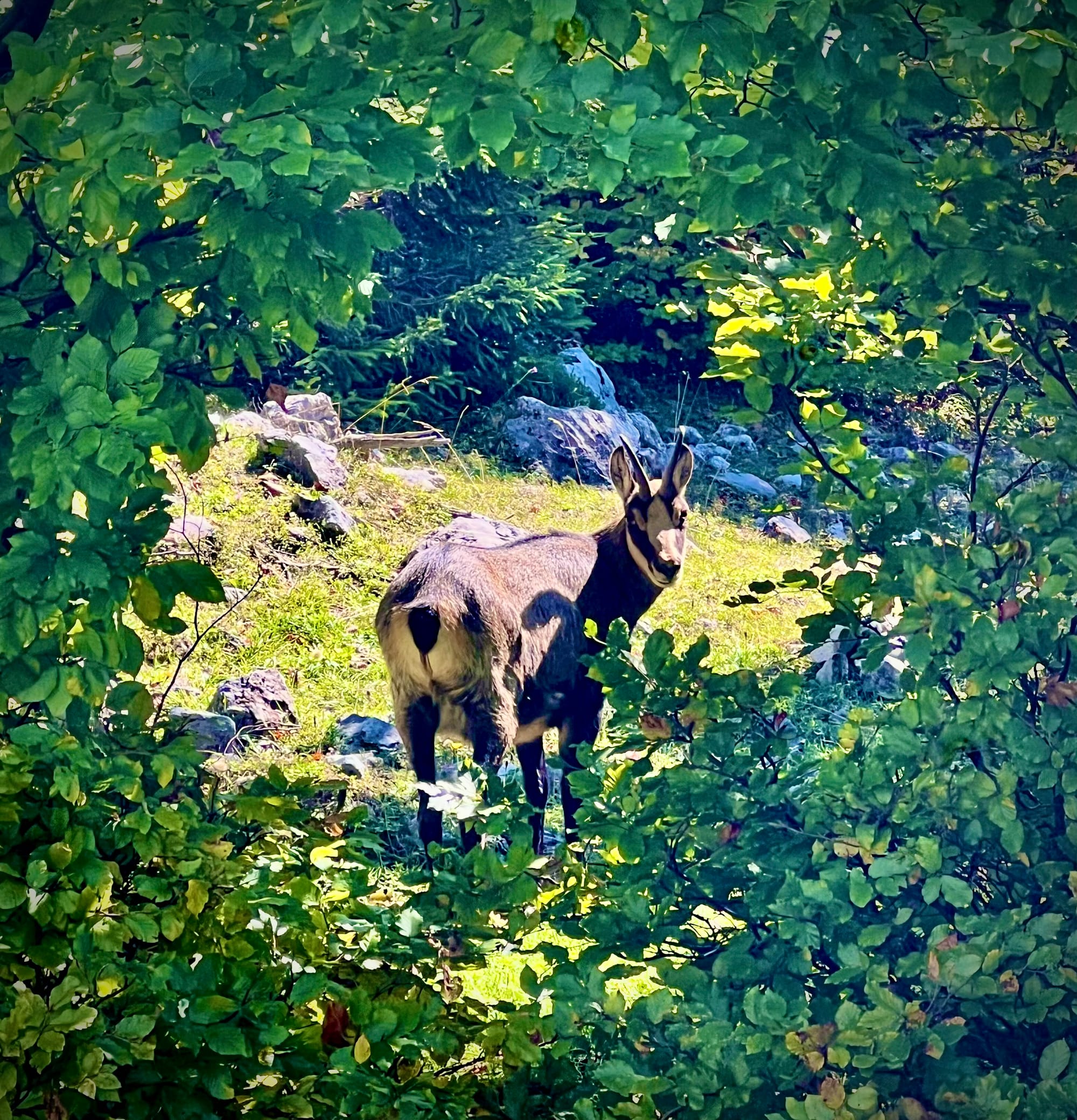 Droga bajkowa, przez polany, ze skałkami, strumieniami, w końcu przez drogę przeskoczyła nam kozica. A jak się zaczęłyśmy rozglądać, to okazało się, że z niedalekiej odległości przygląda się nam wiele par oczu 😀