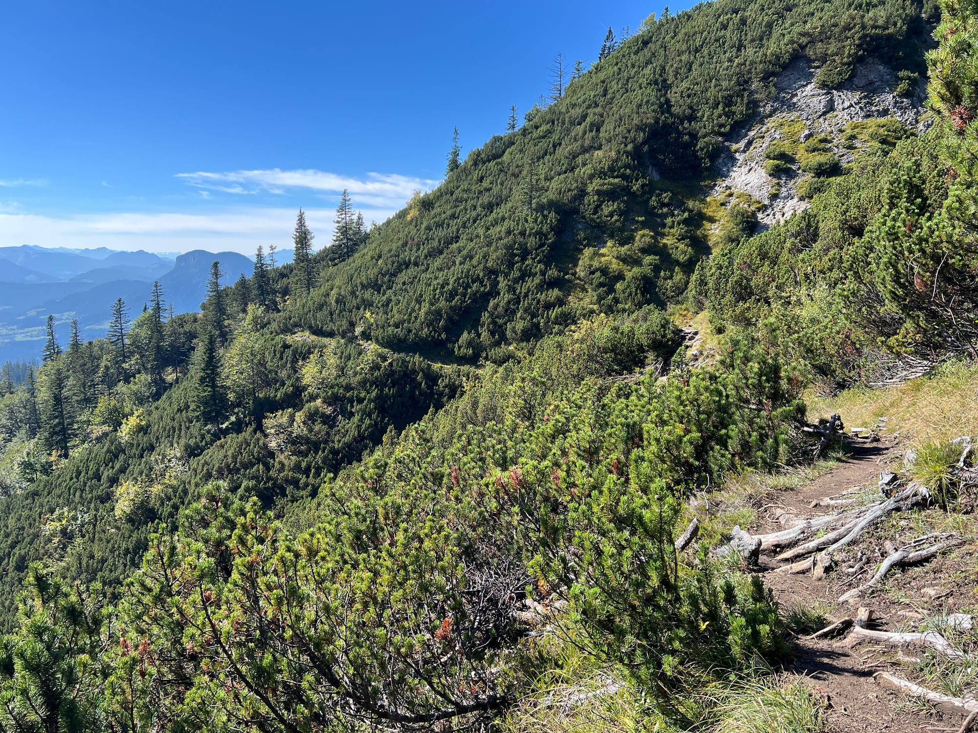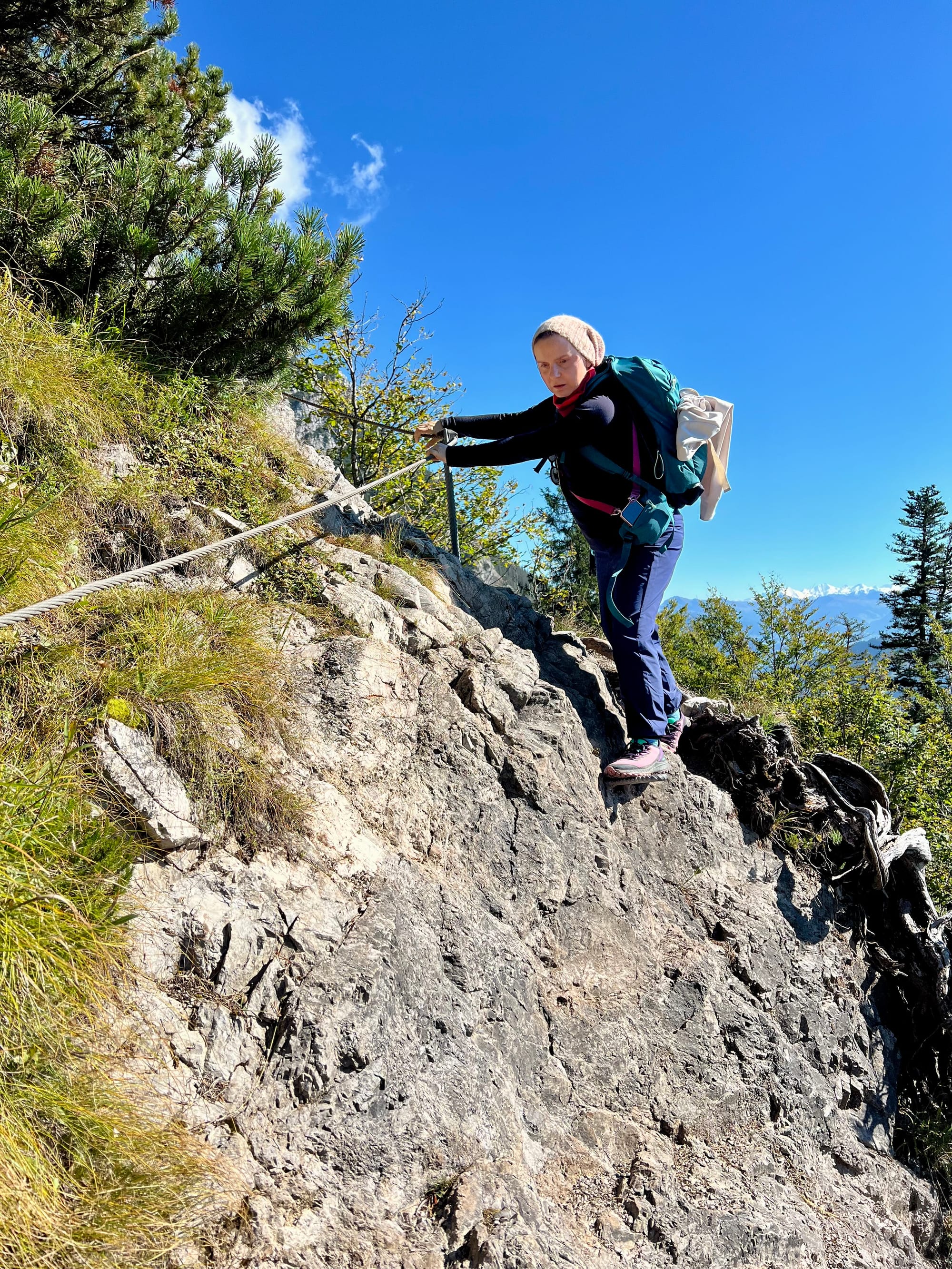 W końcu doszłyśmy na poziom kosodrzewiny i tam droga zaczęła być bardziej wymagająca, bo trzeba się było wspinać trochę po skałkach, przechodzić przez wystające korzenie, nawet wchodzić po schodach. Ale widoki co raz lepsze, aż do lodowców pewnie w okolicach Grossvedediger.