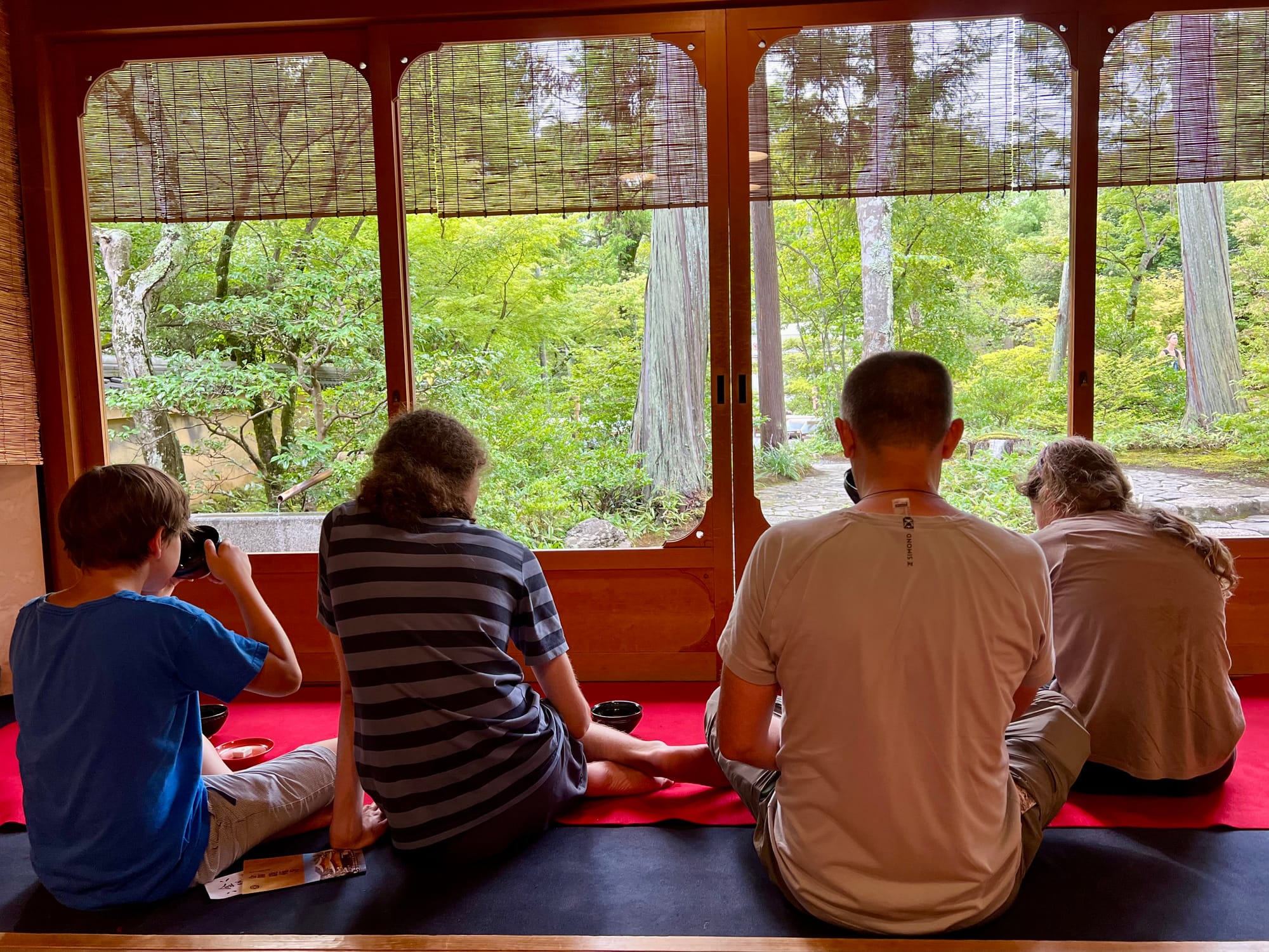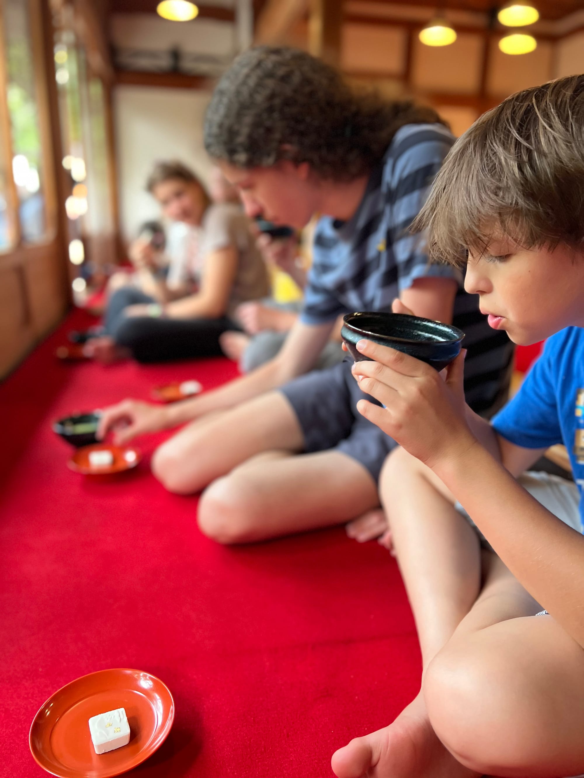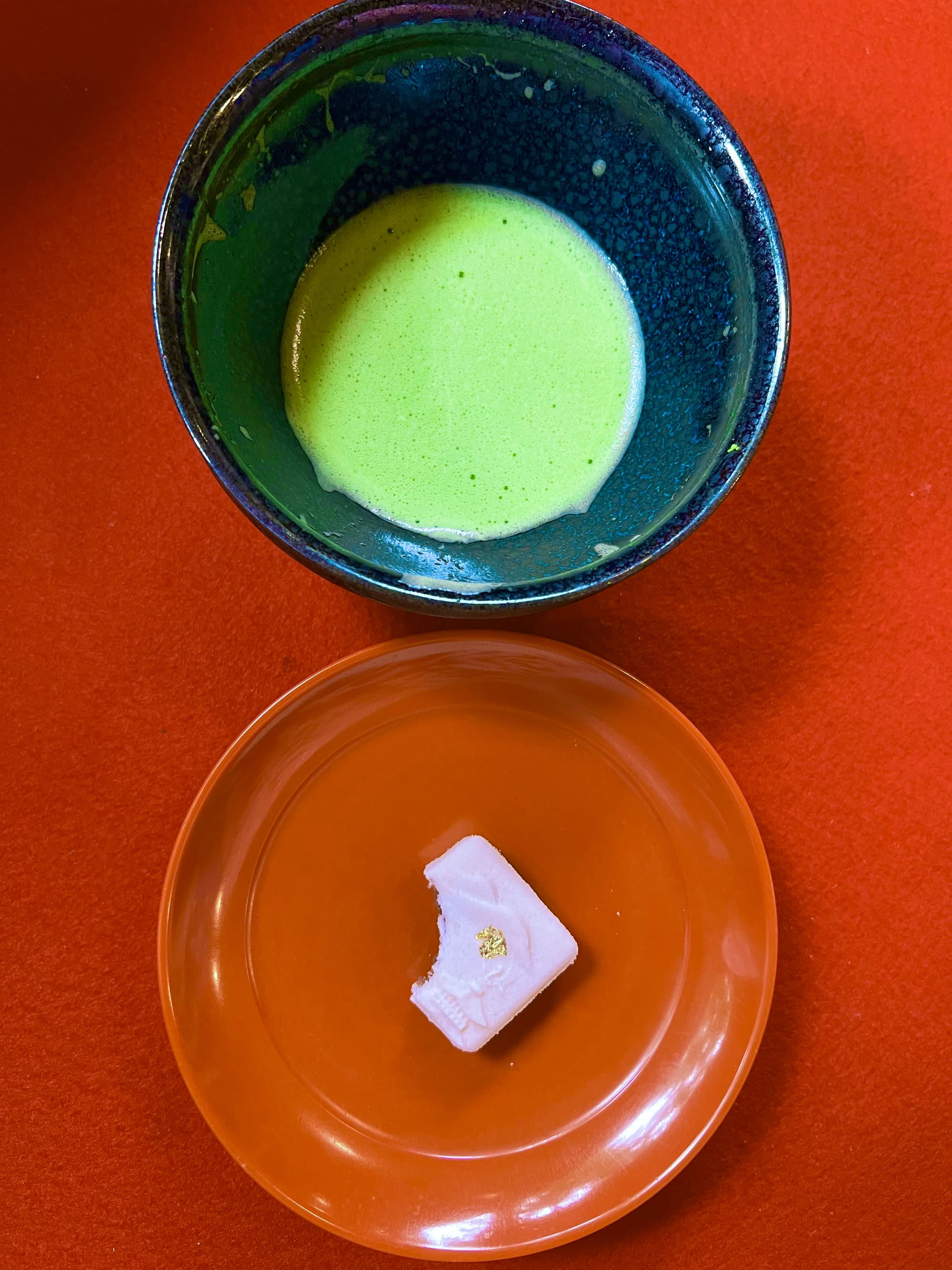 Na koniec jak dla mnie highlight: wizyta w herbaciarni. Podają tam tylko jeden zestaw: herbatę Macha (zimna albo ciepła) i “ciasteczko” z ciasta ryżowego z nadzieniem z czerwonej fasoli. Słodkie, ale chyba posypane solą.