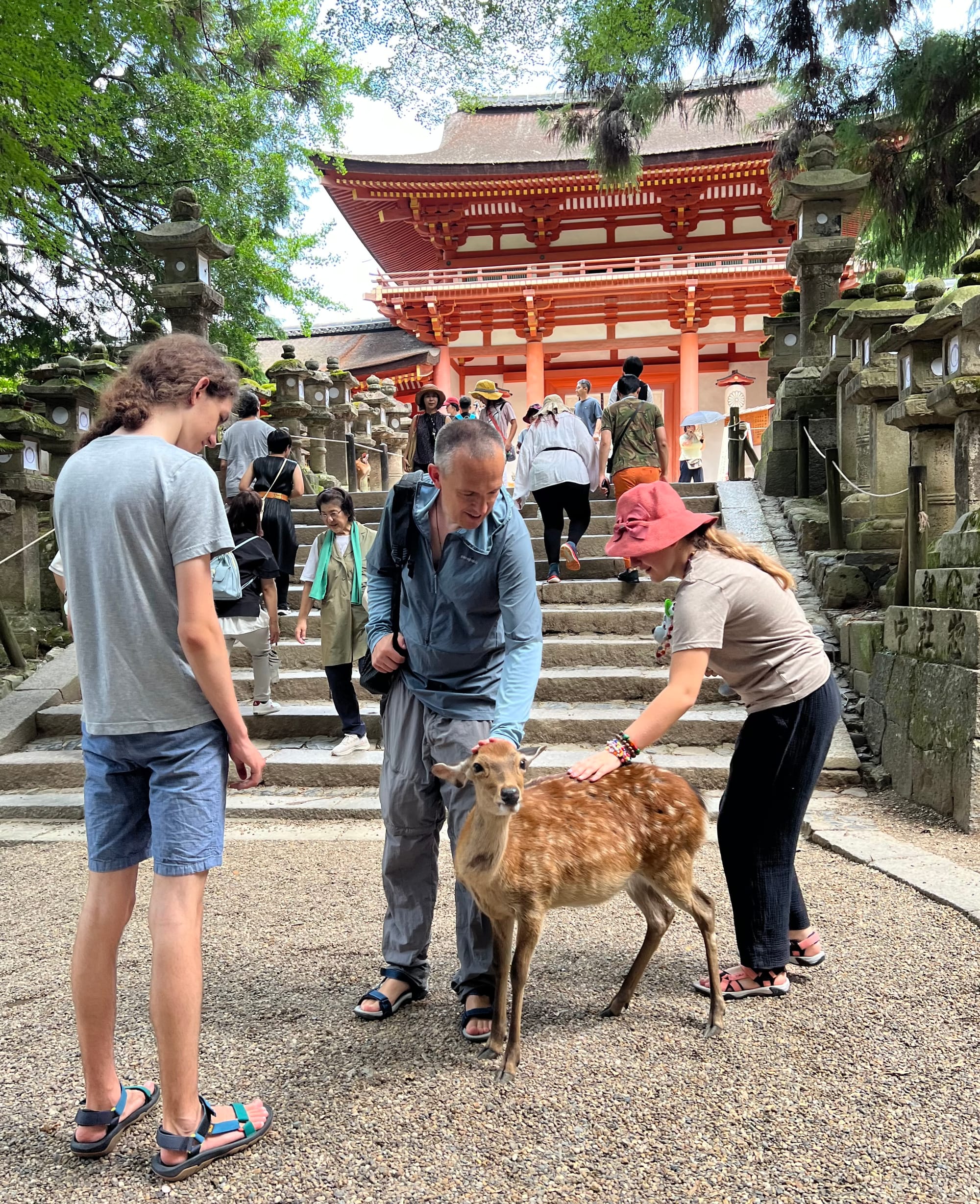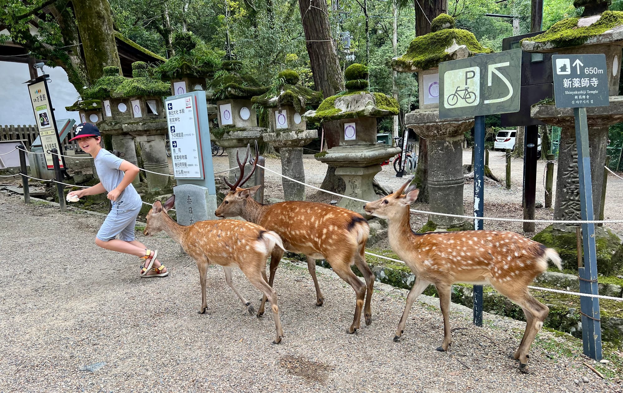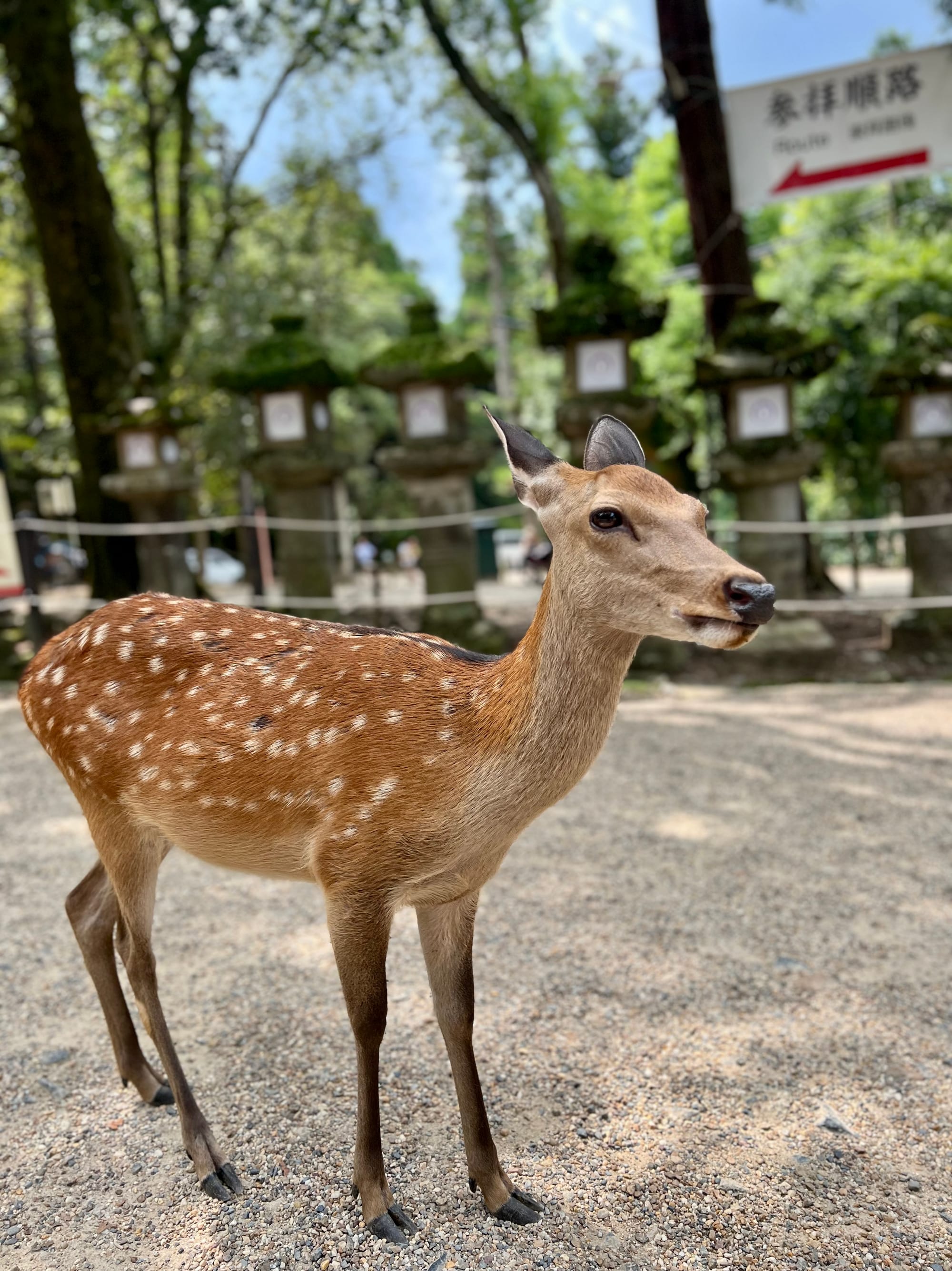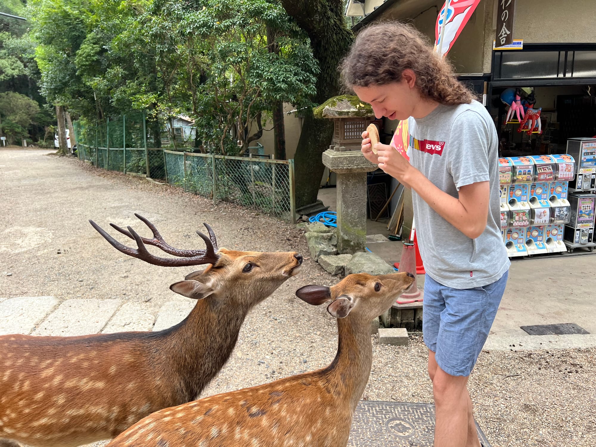 Jedziemy z Kyoto nad morze, trochę odpocząć od miast. Po drodze jest akurat miasto Nara i ma wiele wspaniałych zabytków, ale nas interesują sarenki 😀 W Nara jest ogromny park, tak duży, że idą przez niego ulice, jeżdżą autobusy i jest kiła świątyń. Myślałam, ze te sarenki tylko w jednym, wydzielonym miejscu są, a one sobie tak luzem łażą, same i w stadach po całym tym parku! Siedzą przy ulicach, przechodzą przez pasy.