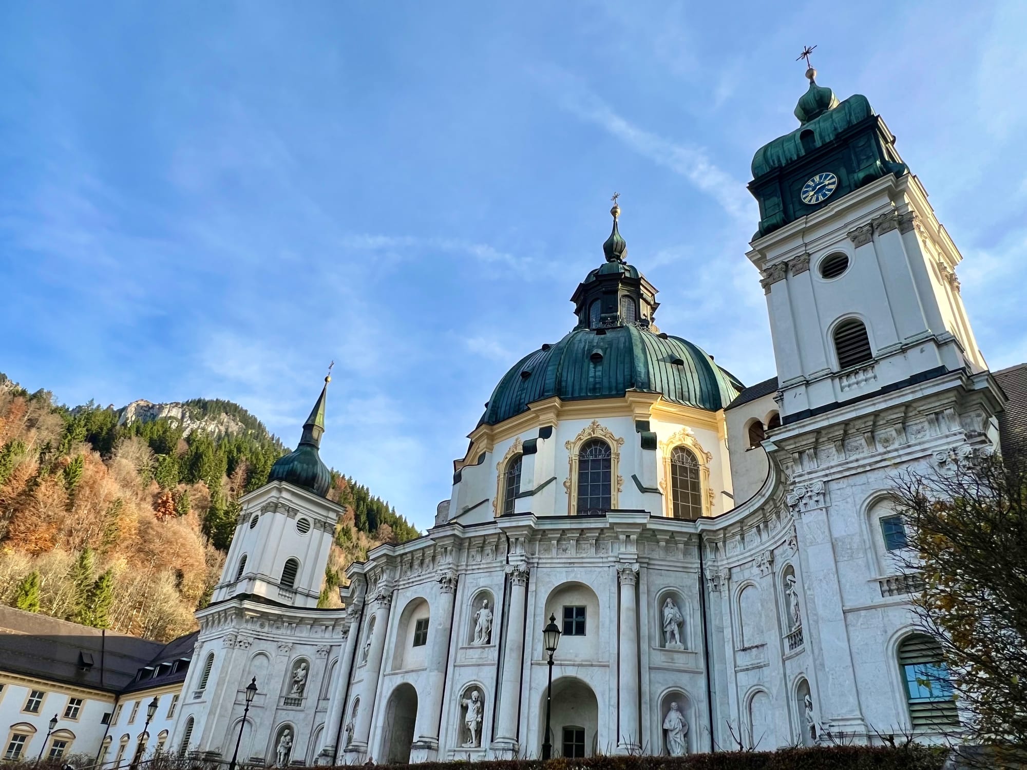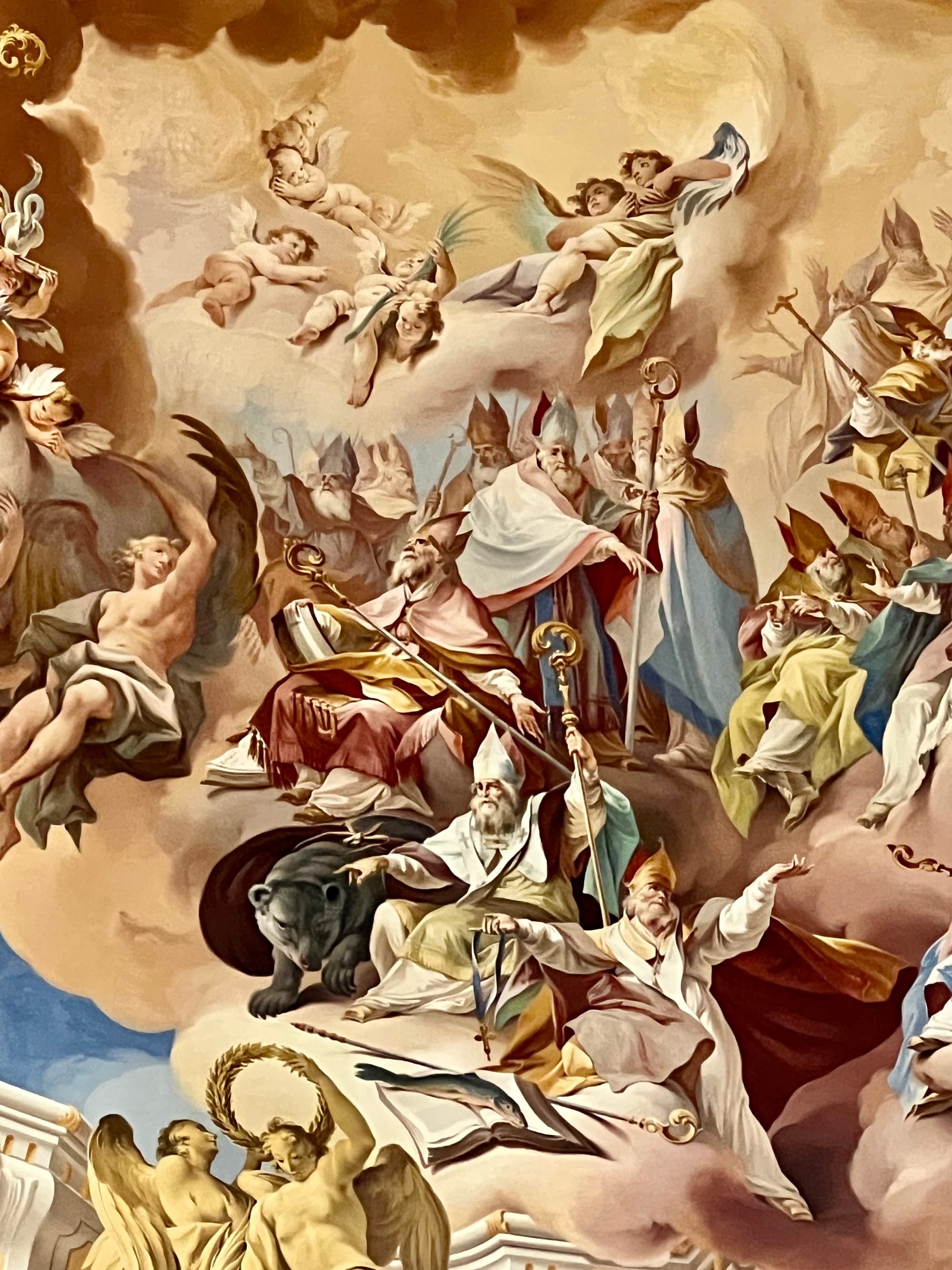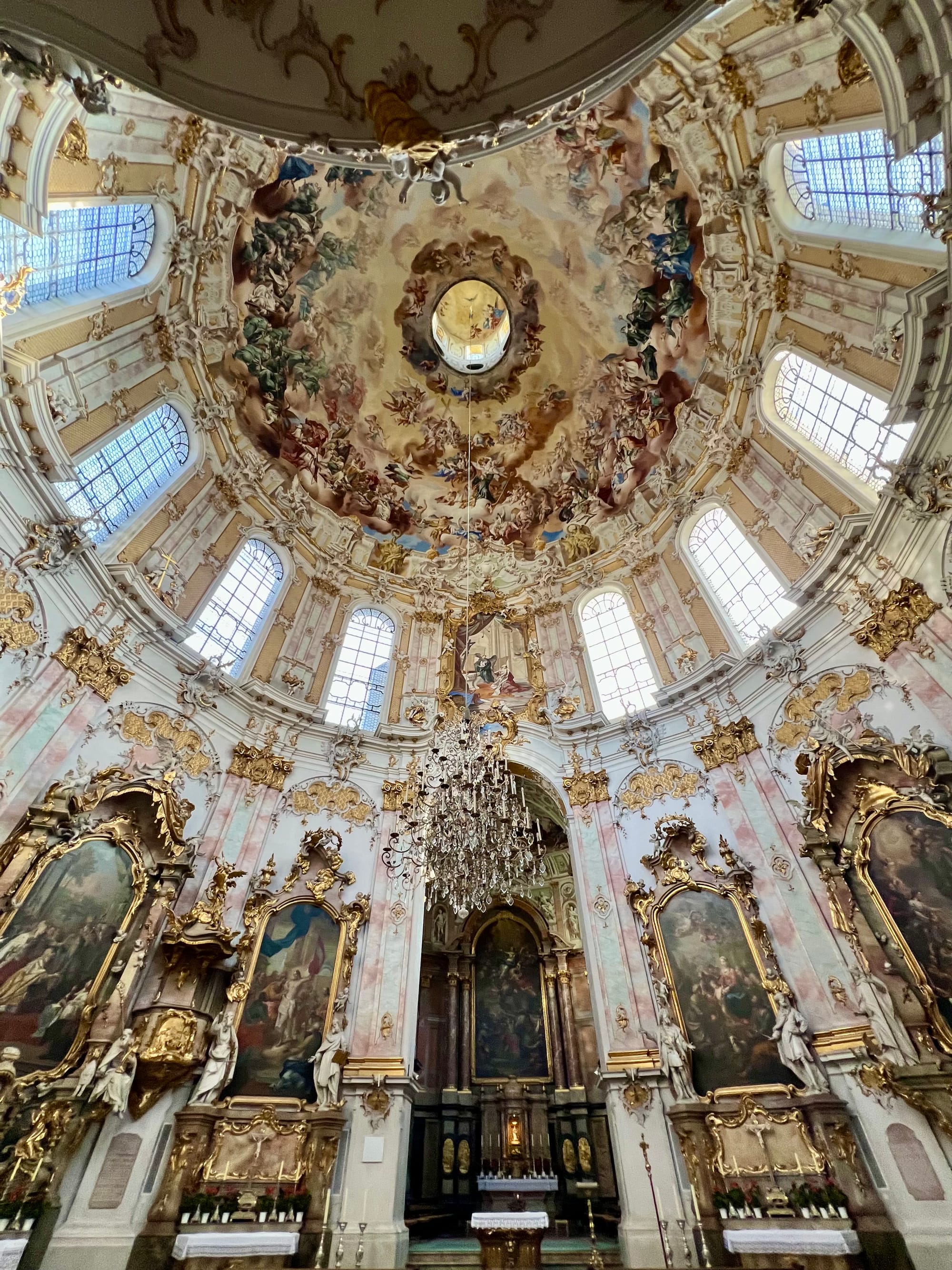 First things first, więc najpierw parkuje przy klasztorze w Ettal i idę na Mszę. Ksiądz kazał nam się patrzeć na kopułę bazyliki, żeby oglądać świętych w niebie i odkryłam tam naszego Korbiniana z niedźwiedziem.