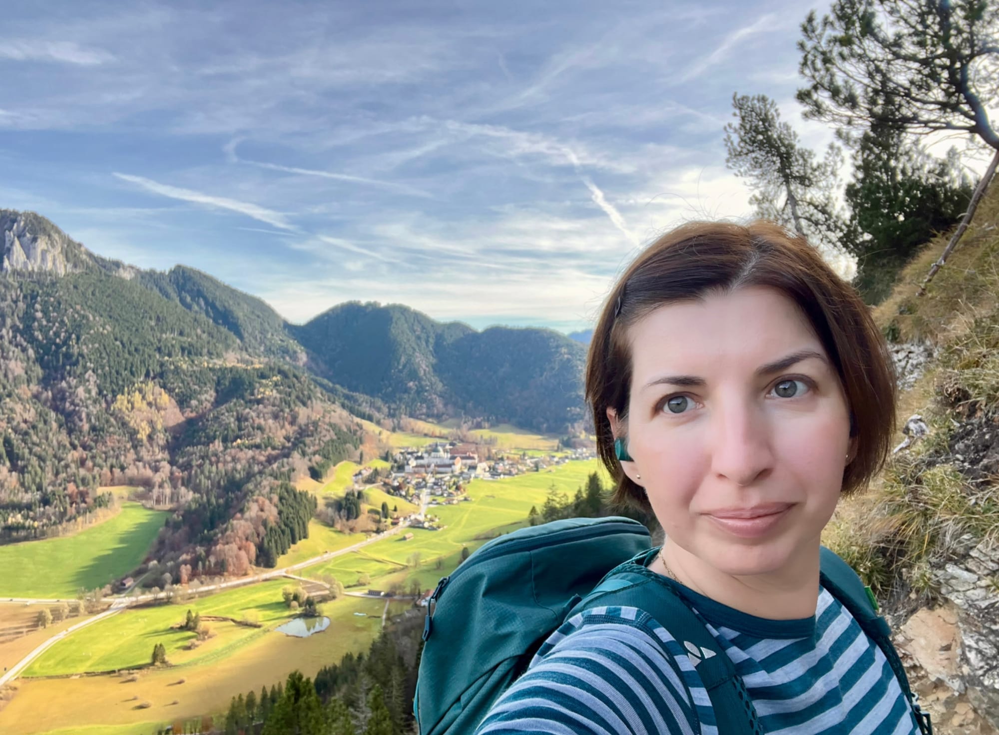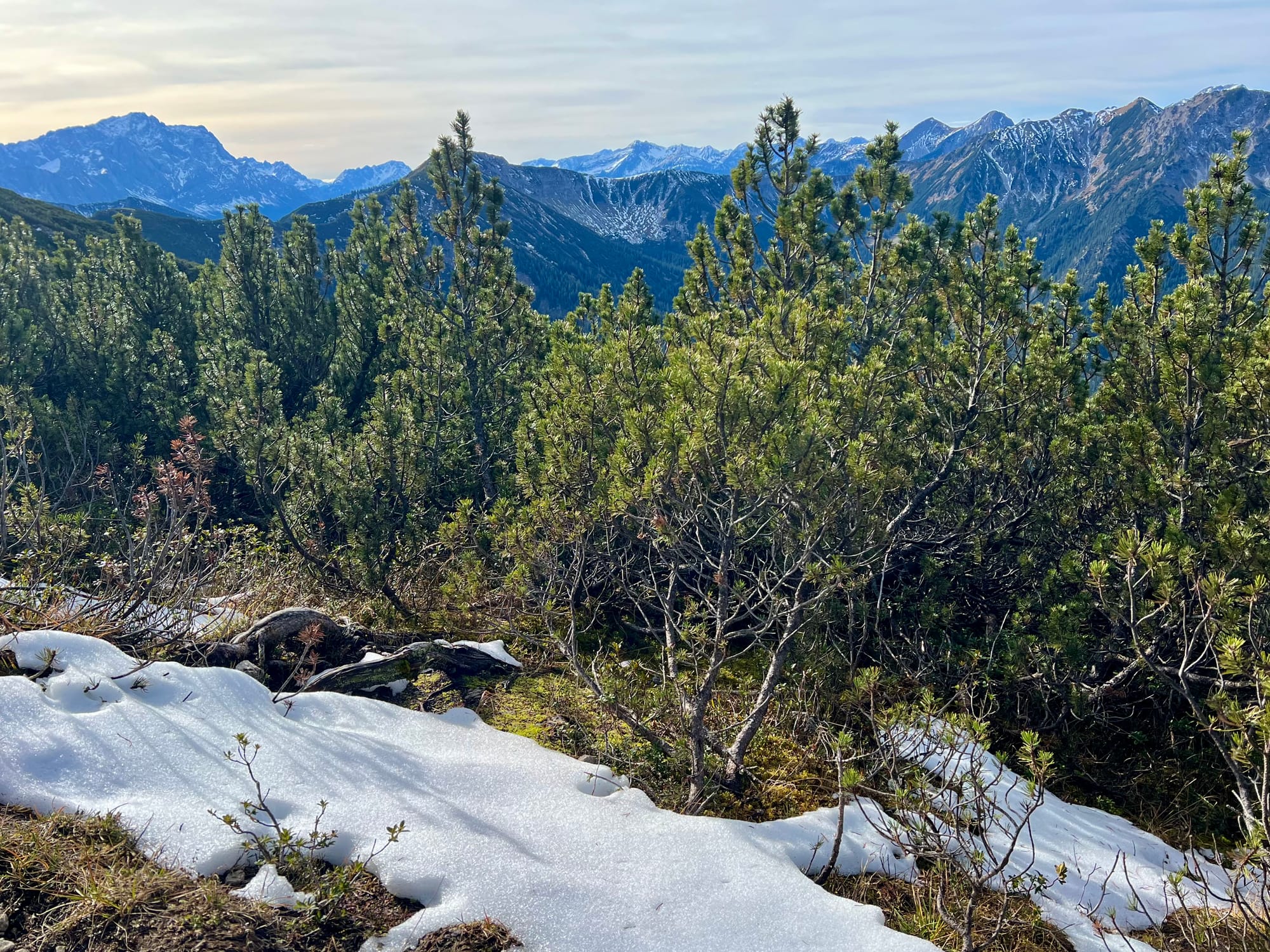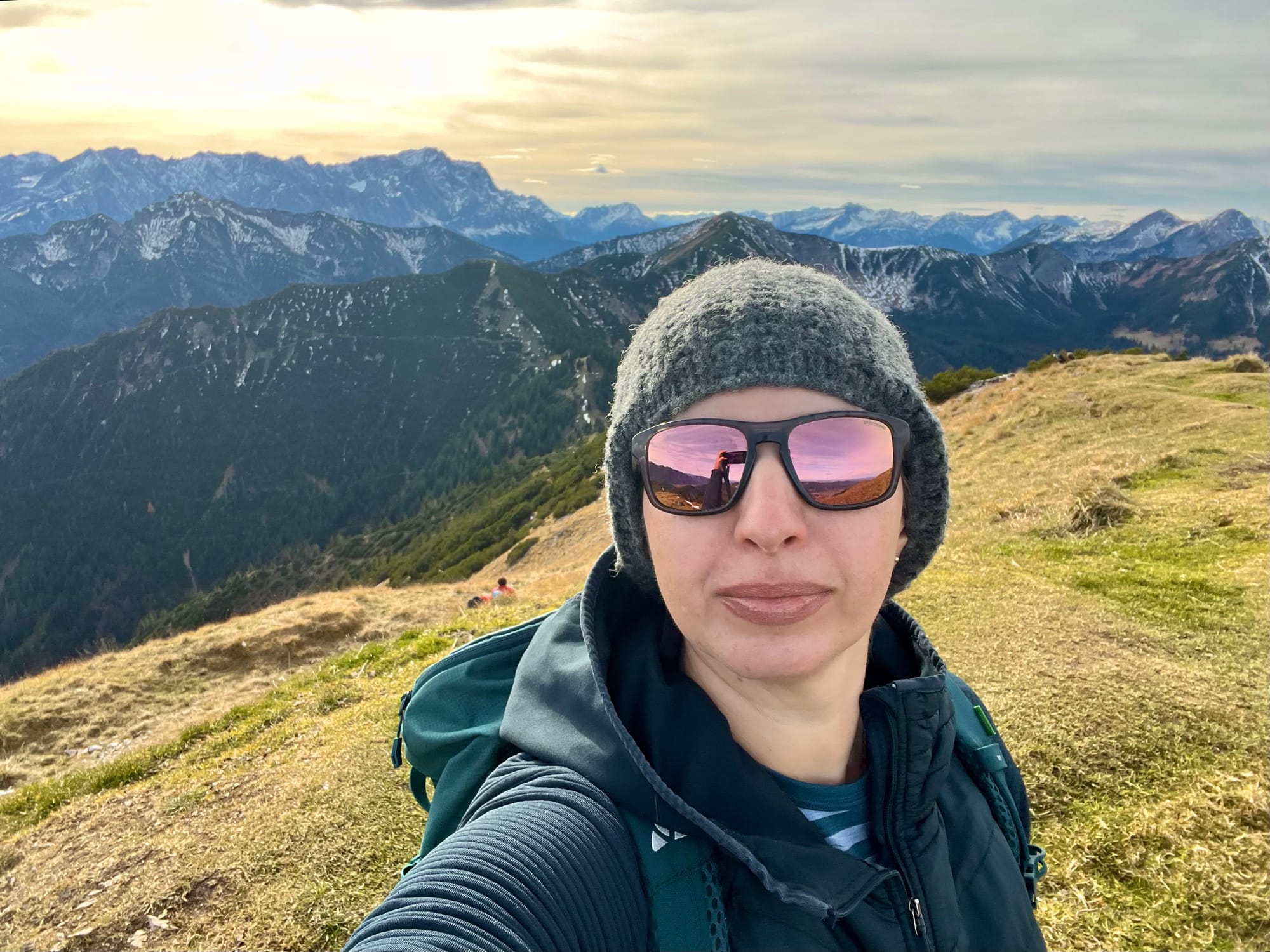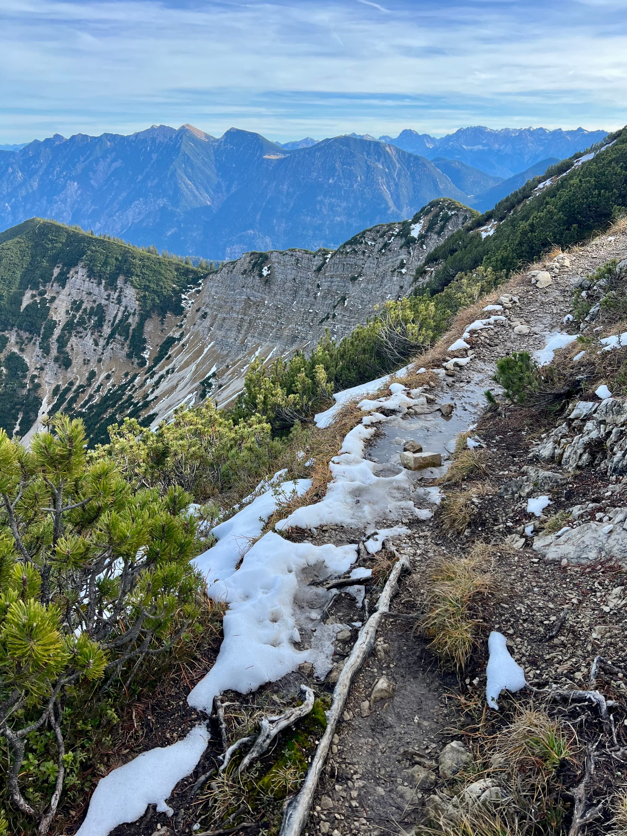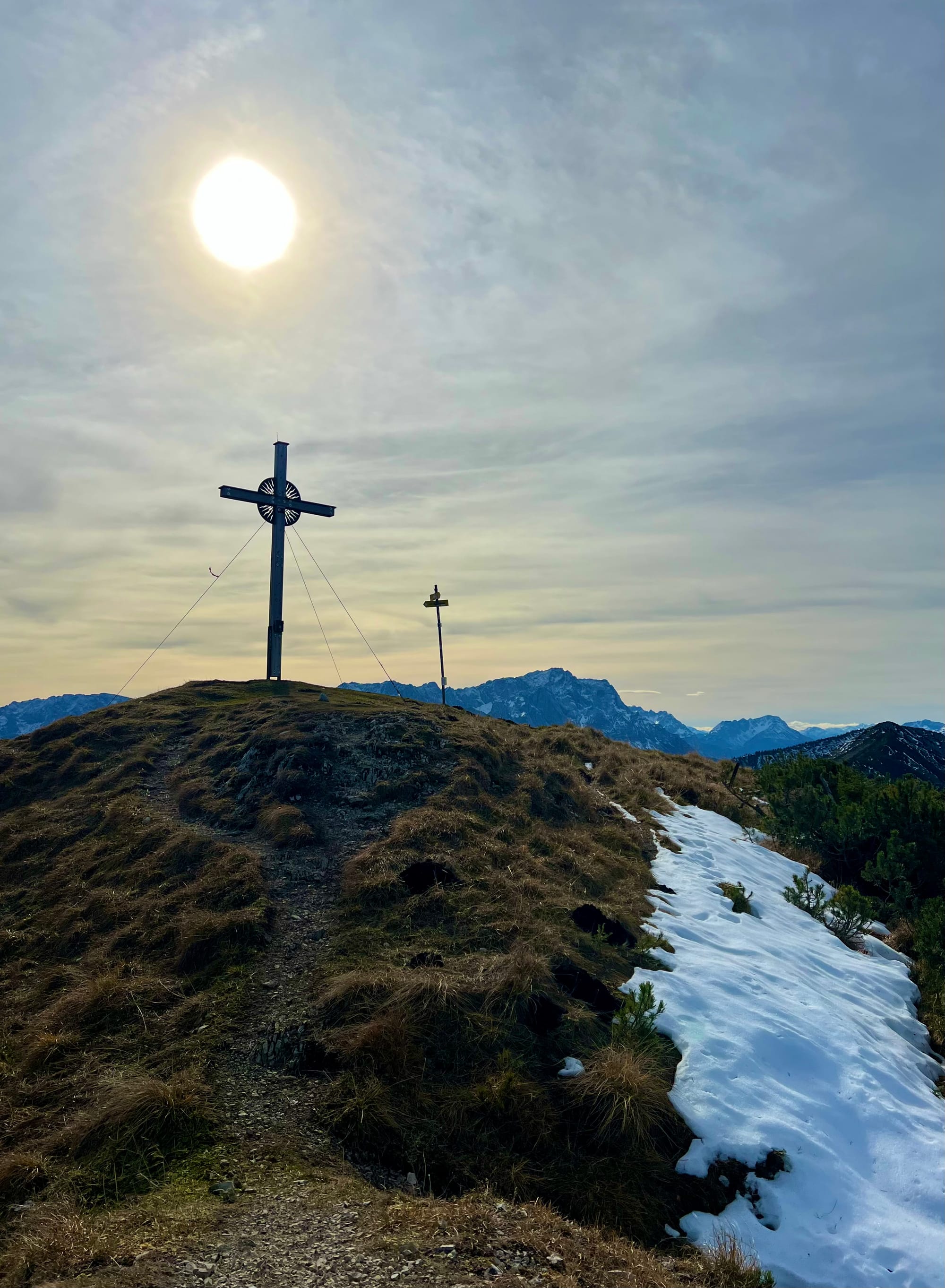 Jeszcze z 300 metrów w górę, trochę po śniegu (zaczęłam się martwić, czy dam radę wejść bez moich raczków), w końcu w oddali widać szczyt! No i otwiera się panorama Alp na drugą stronę.