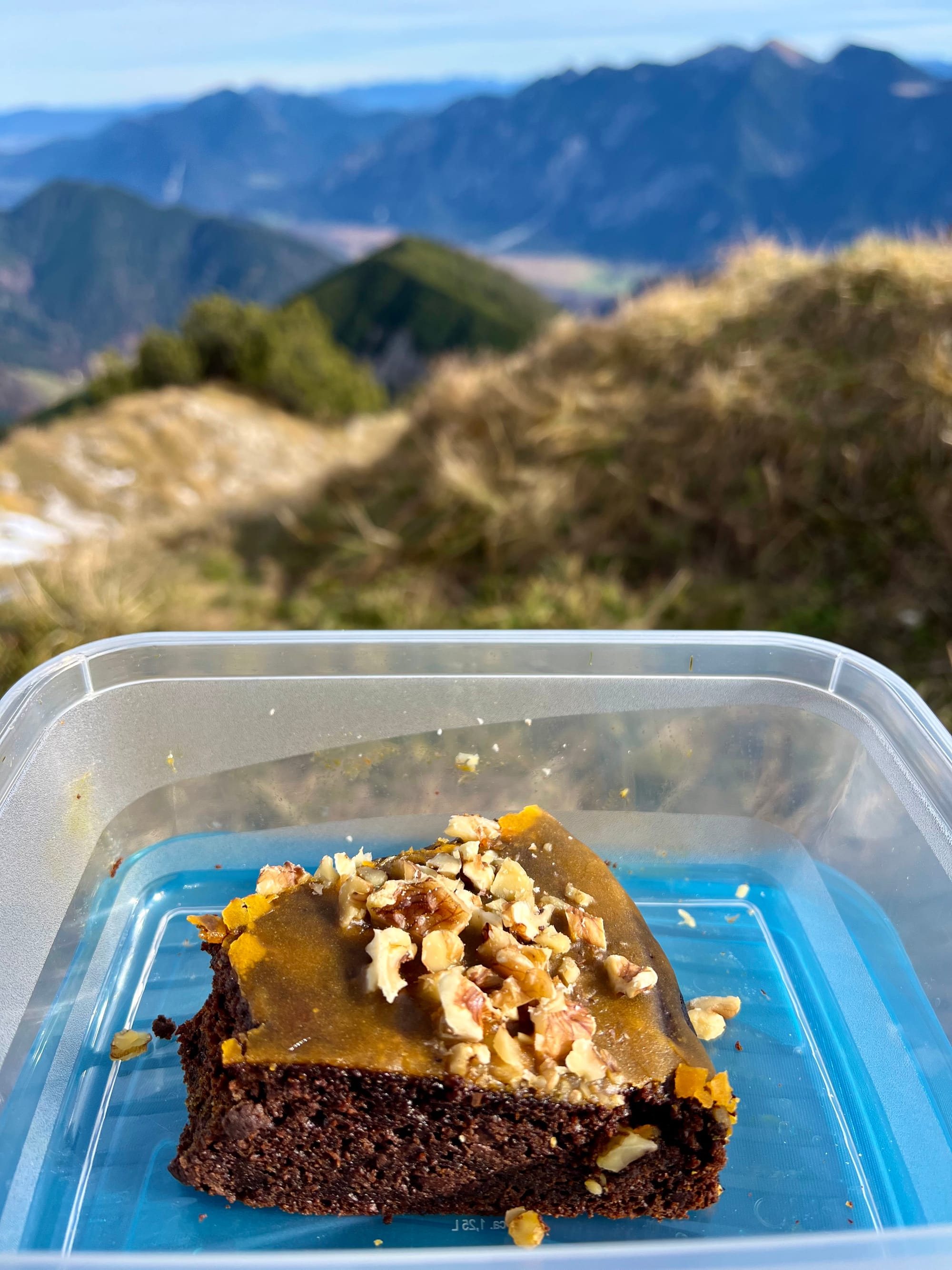U góry jest słonecznie ale wieje i to dosyć mocno. Jest kilku ludzi, wszyscy chowają się gdzieś poniżej szczytu przed wiatrem. Zjadam kanapki, przepyszne ciasto czekoladowo -dyniowe (+ 10 punktów do smaku po takim wysiłku) i zbieram się do zejścia w dół.