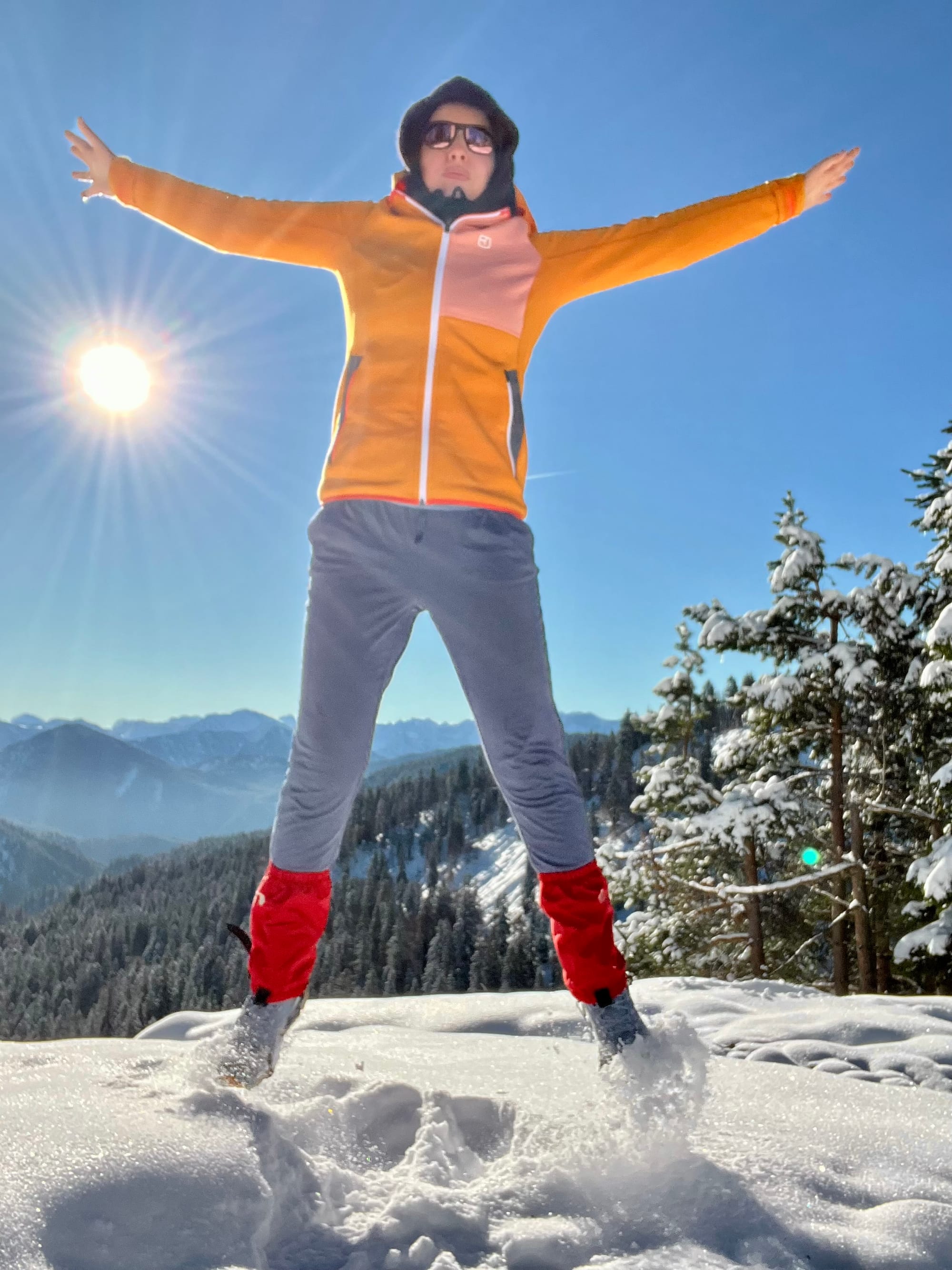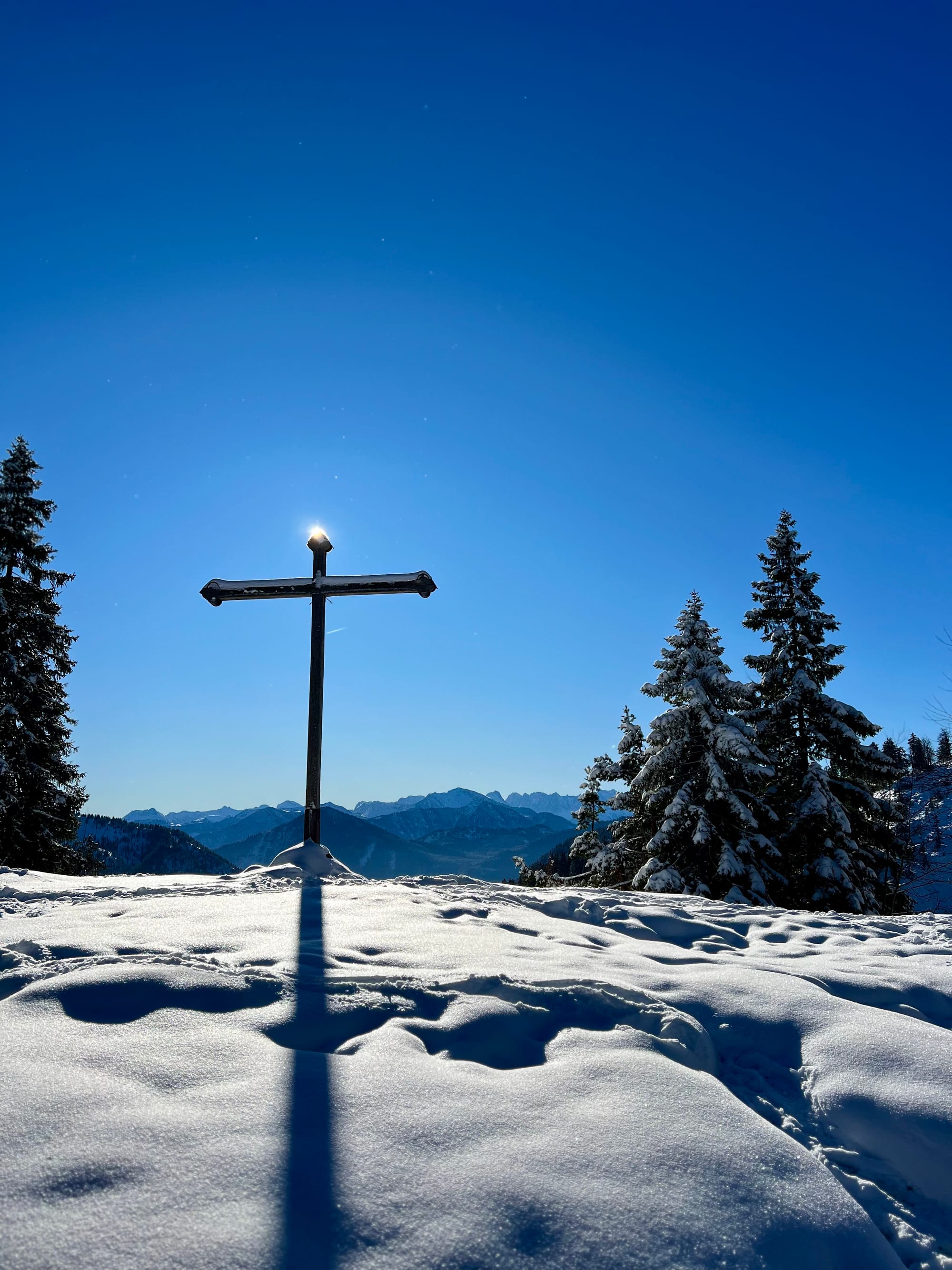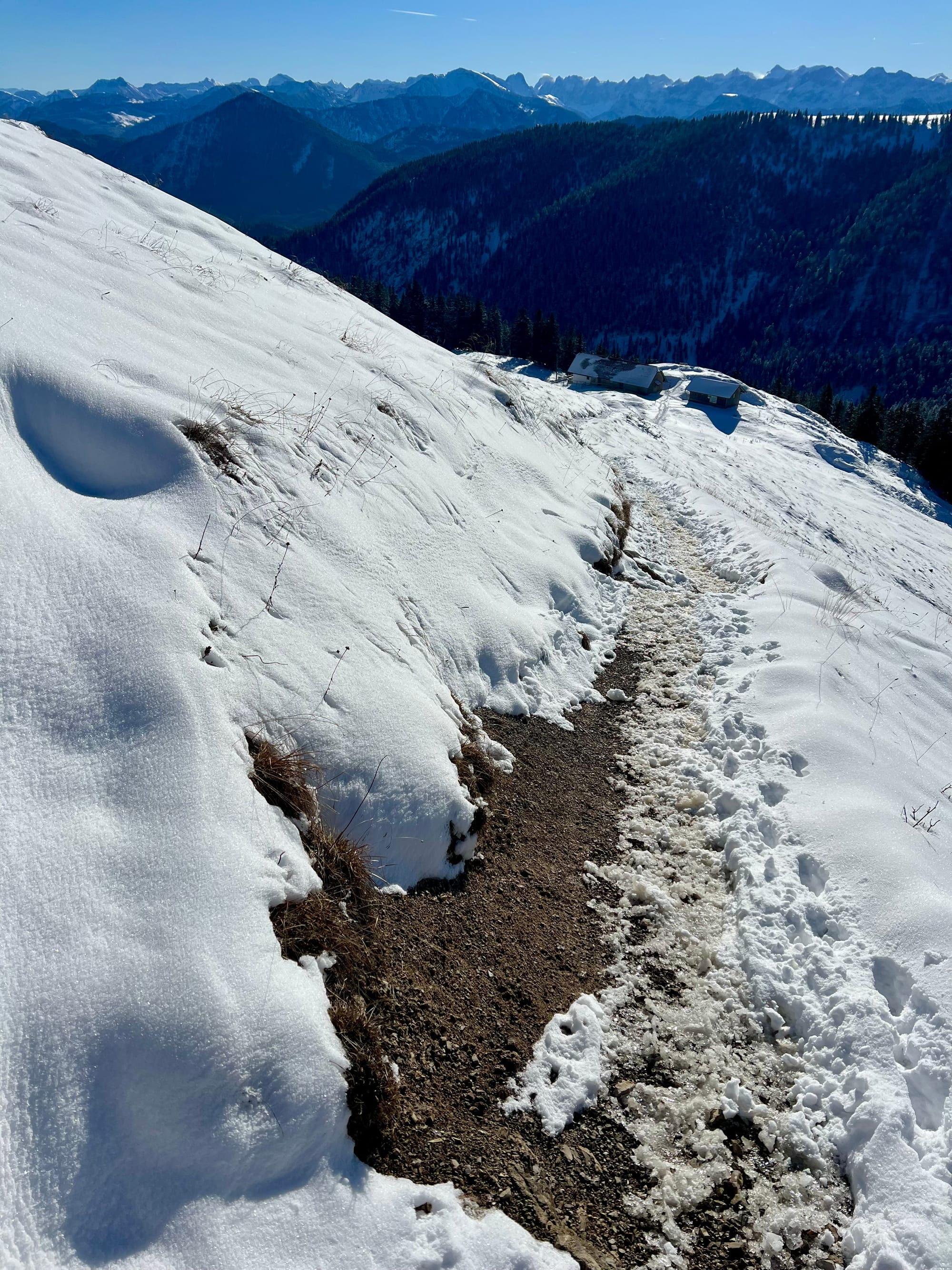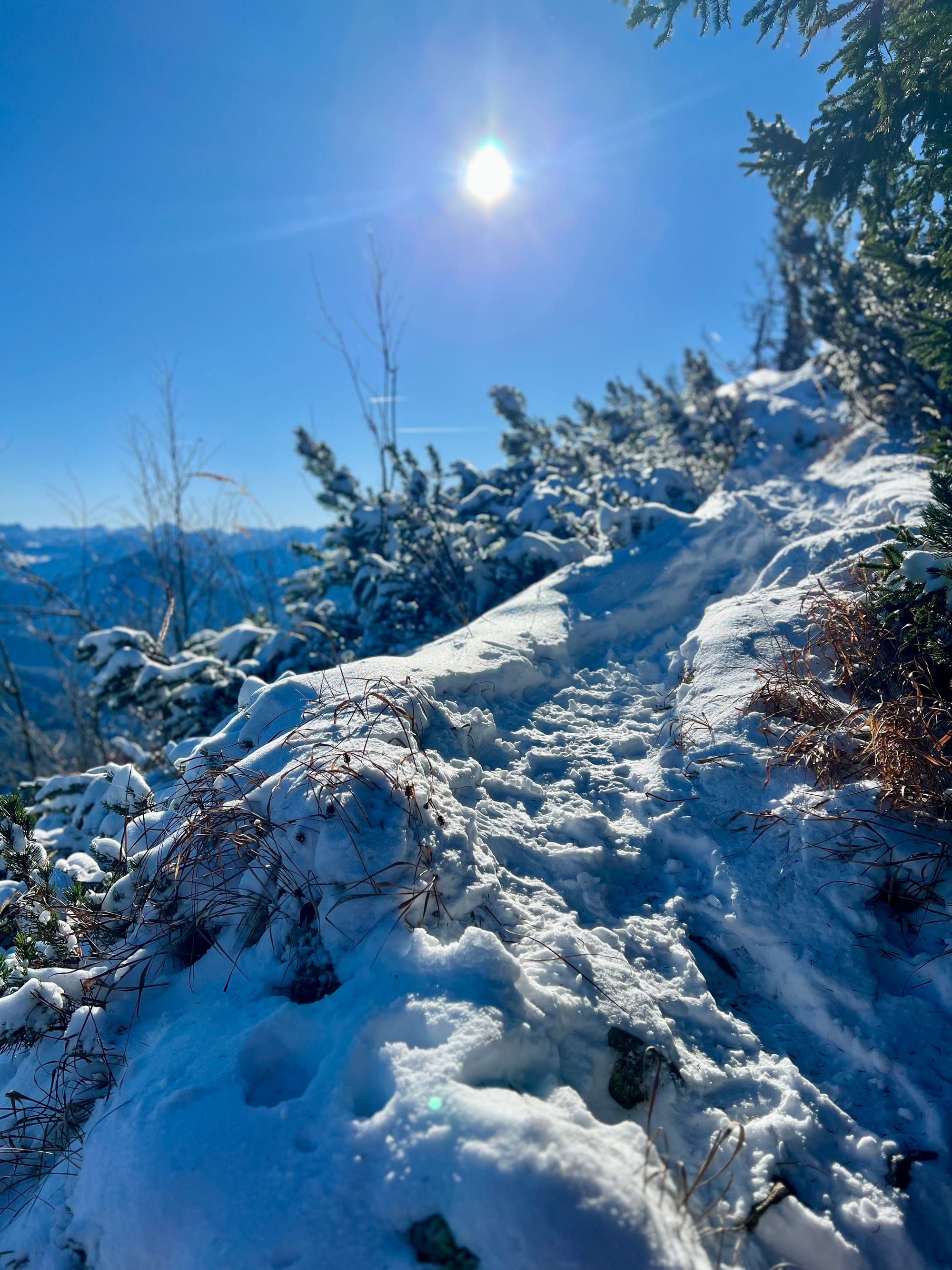Wyszłam na Rabenkopf przy Benediktbeuern. Rano było -14 (!!), później przeszłam na słoneczna stronę góry i było dużo przyjemniej. Im wyżej, tym więcej śniegu. Potrzebne mi były moje mini-raki i ochraniacze na buty, bo czasem ślisko, czasem śniegu tyle, że wpadał góra do butów.