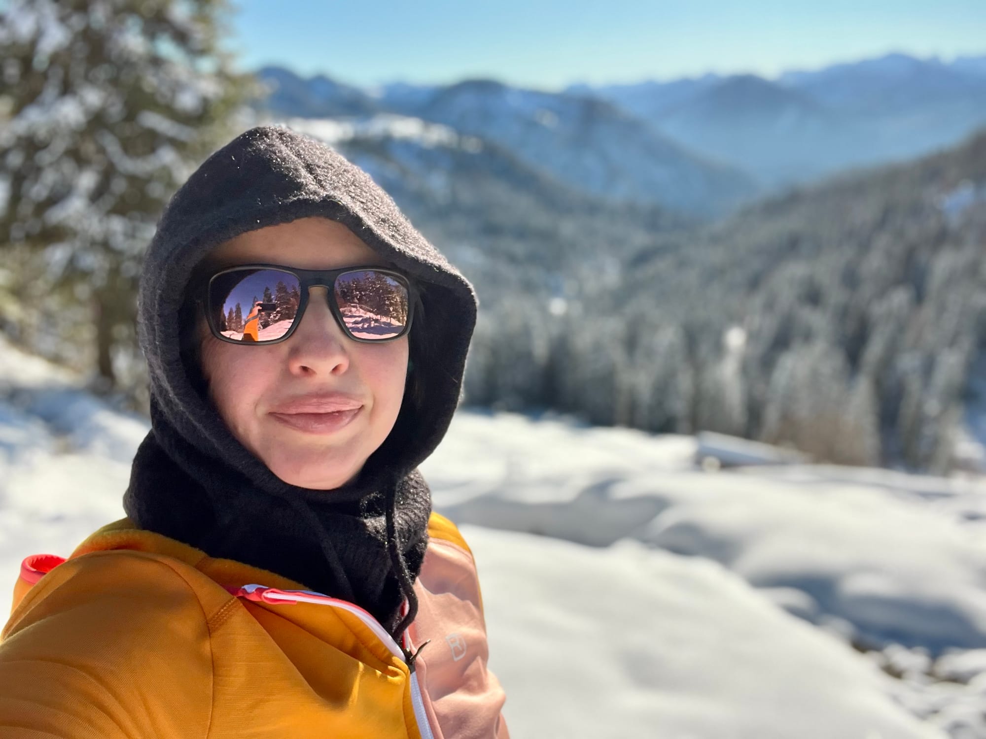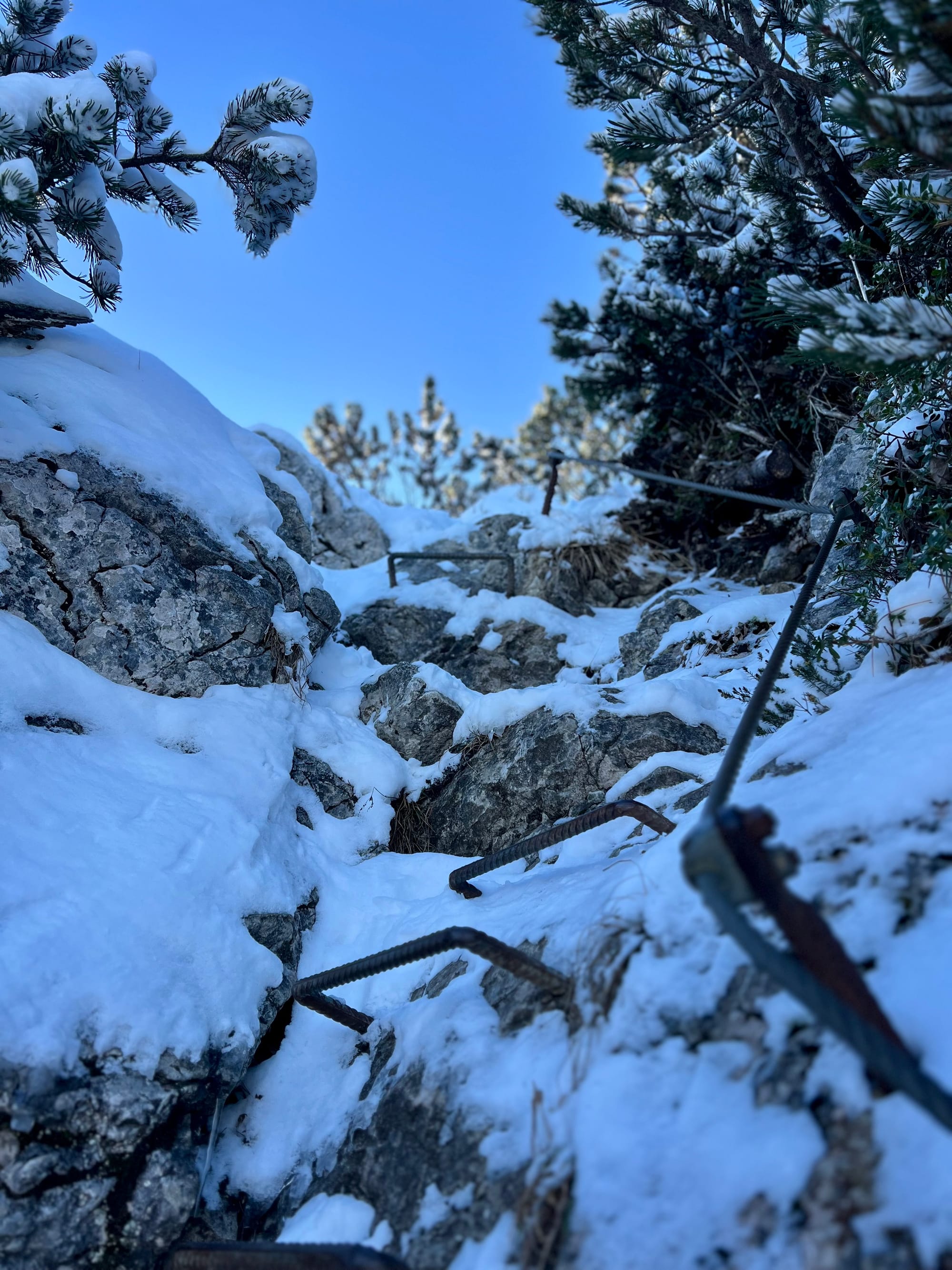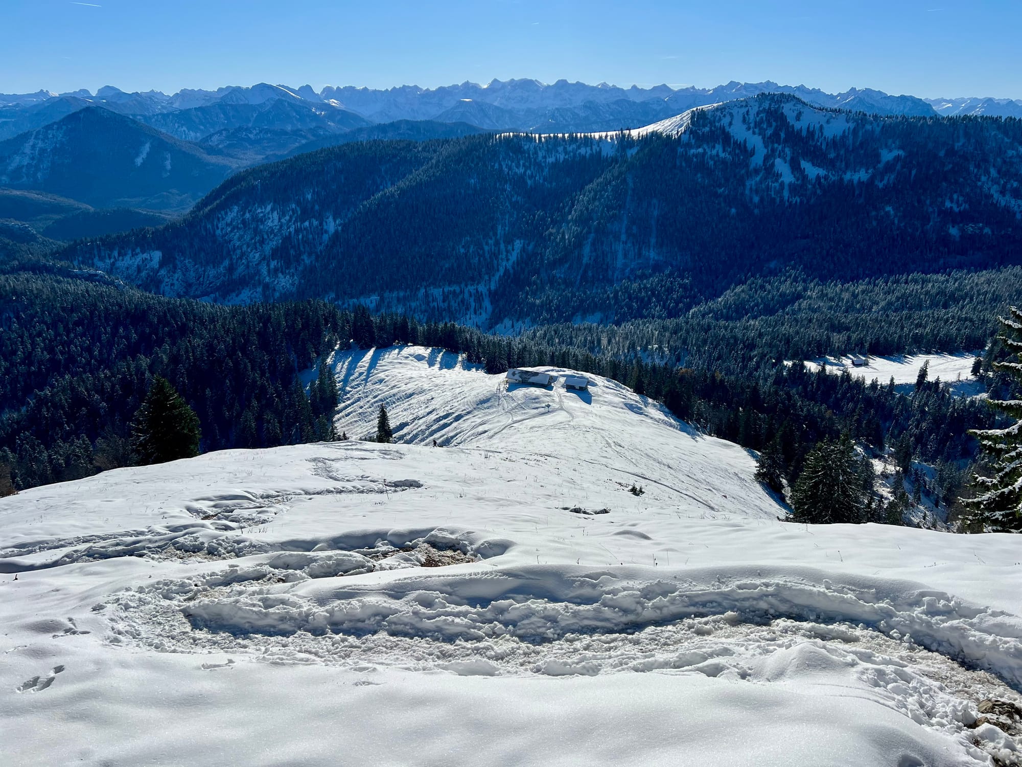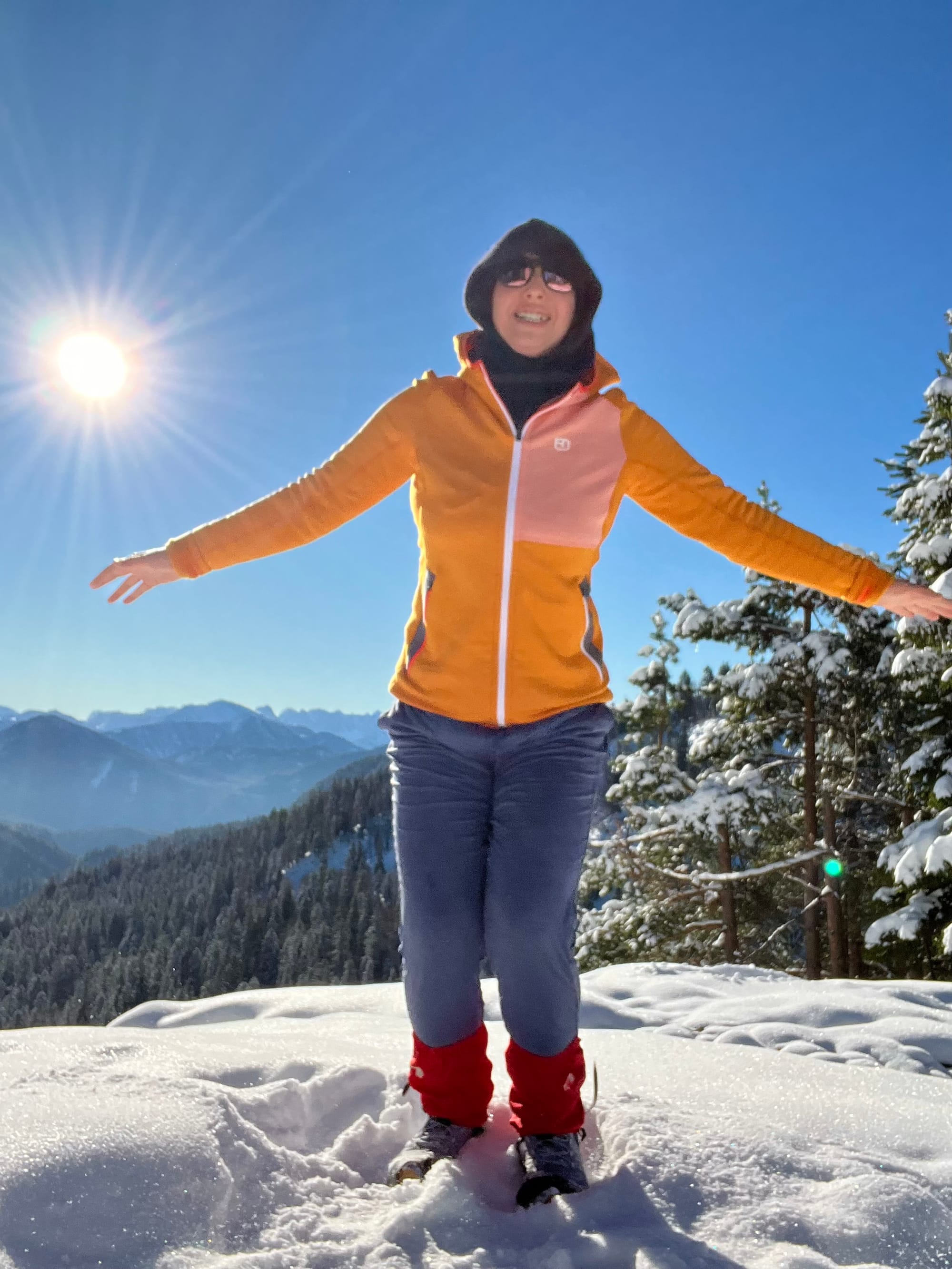 Wyszłam na Rabenkopf przy Benediktbeuern. Rano było -14 (!!), później przeszłam na słoneczna stronę góry i było dużo przyjemniej. Im wyżej, tym więcej śniegu. Potrzebne mi były moje mini-raki i ochraniacze na buty, bo czasem ślisko, czasem śniegu tyle, że wpadał góra do butów.
