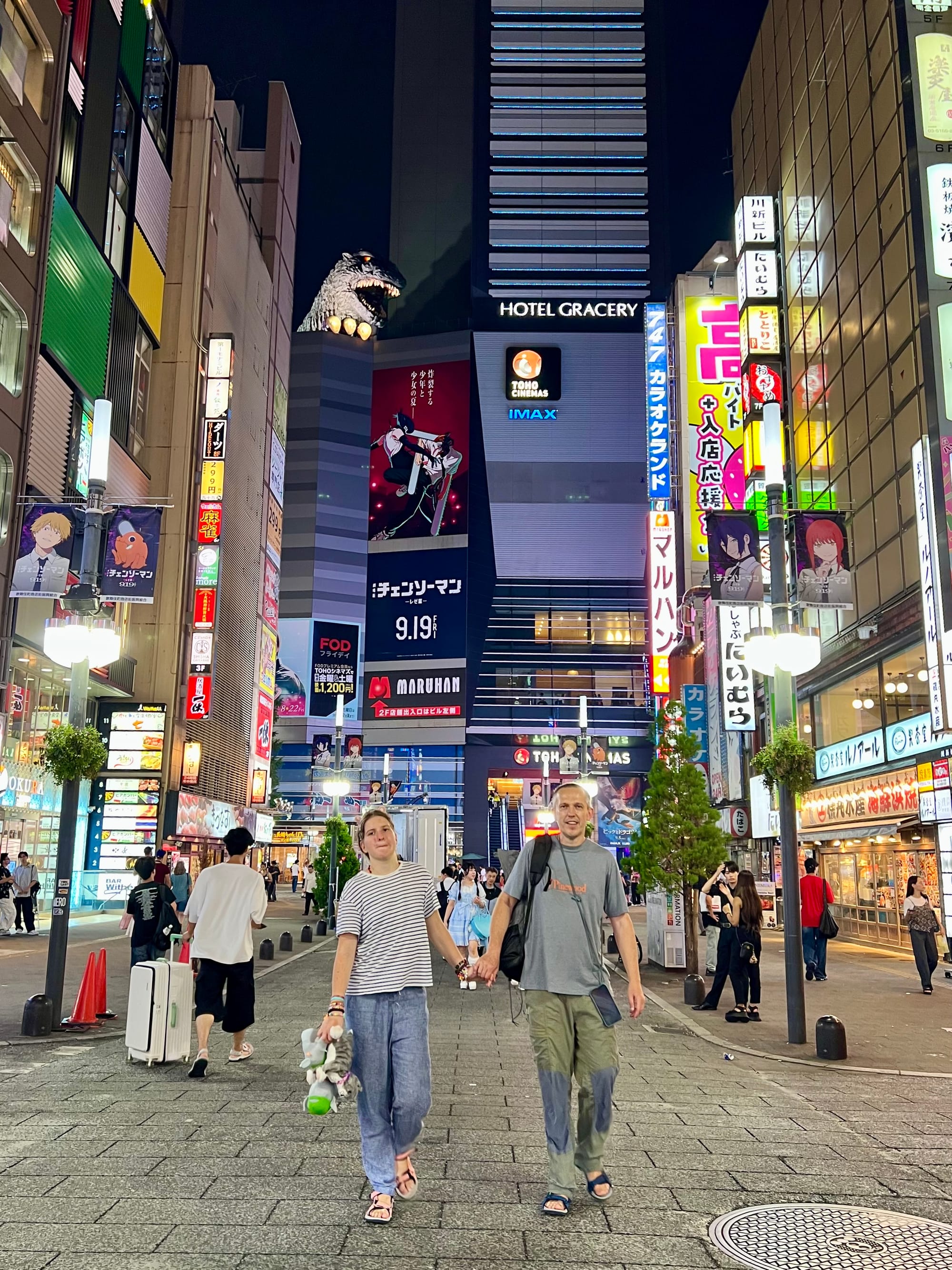 Później zmiana miejsca i jesteśmy w samym środku nocnego życia z kotem 3D i Gozilla 😀 On czasem puszcza jakieś dymy z pyska, ale akurat nie trafiliśmy.