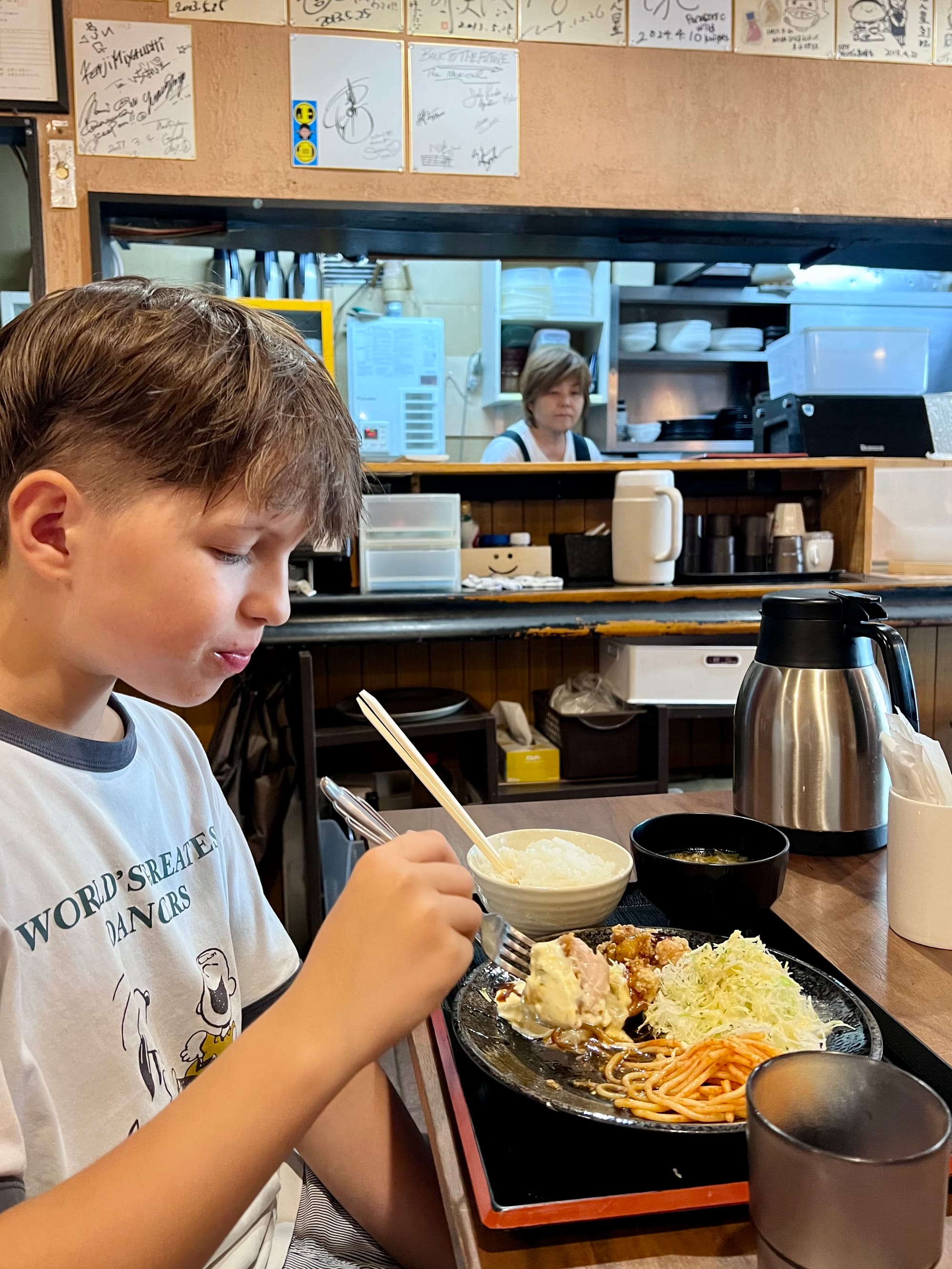 Dalej poszliśmy na obiad. W planach była knajpa meksykańska, tak, żeby Mają też coś zjadła, bo z nią różnie bywa, ale akurat była zamknięta. Za to obok była taka tradycyjna, japońska. Wzięliśmy tam wszyscy zestawy, Maji też i ona to zjadła!