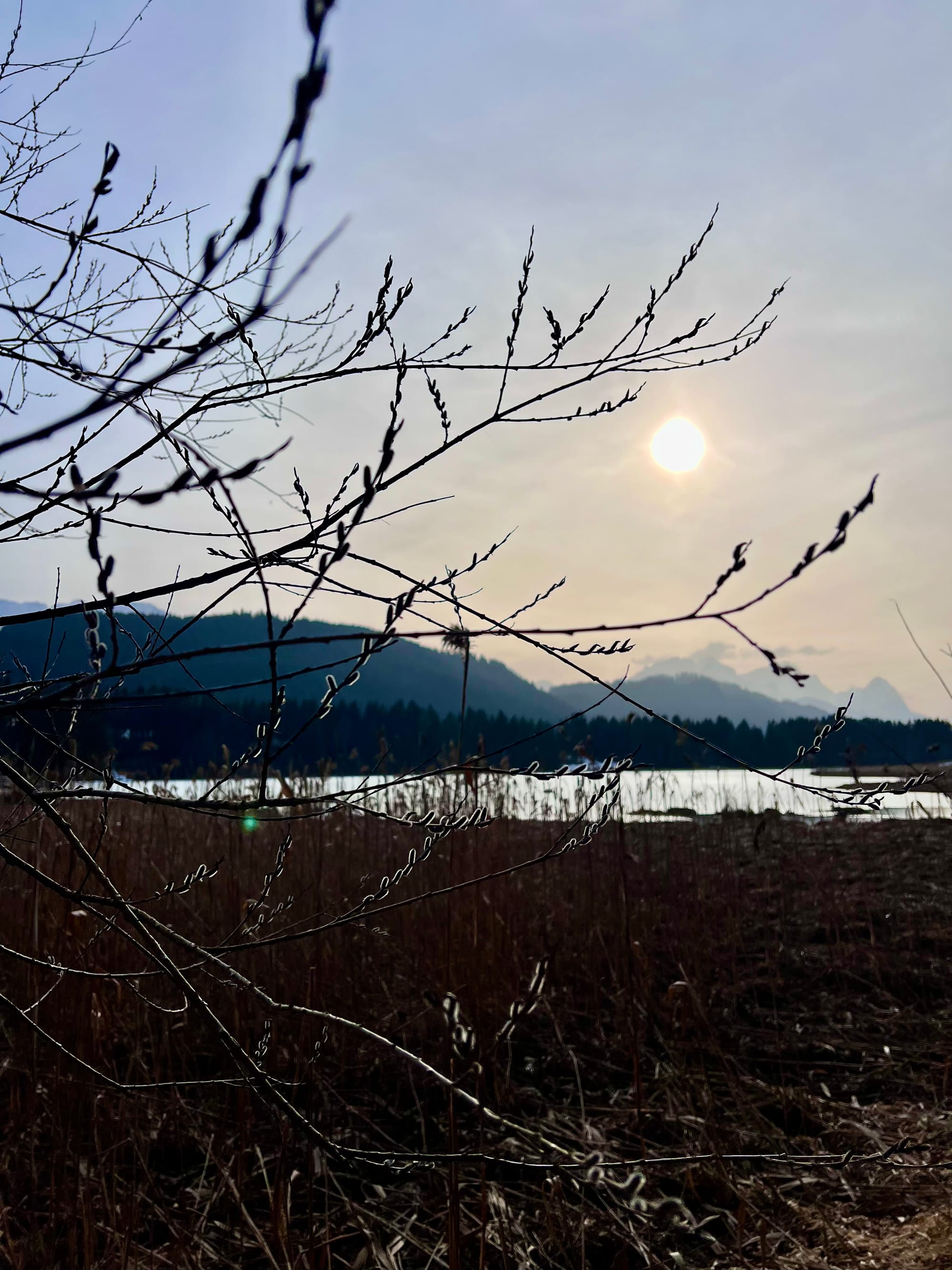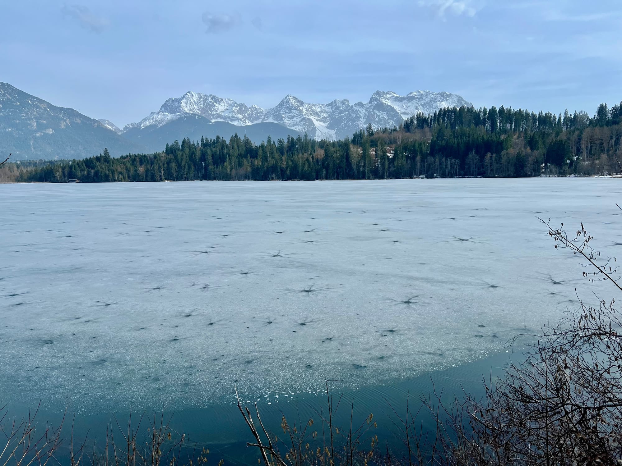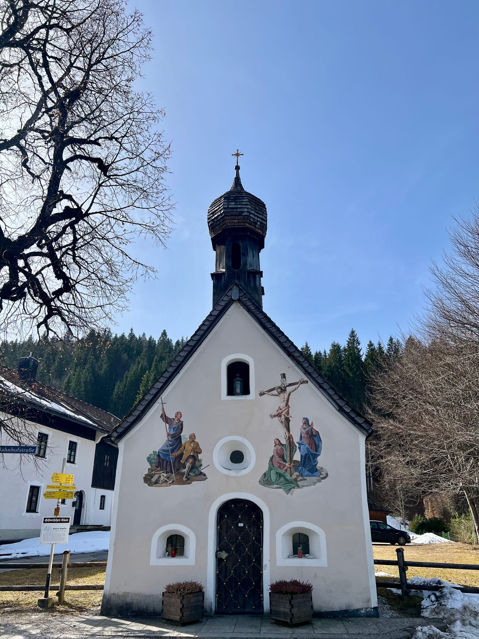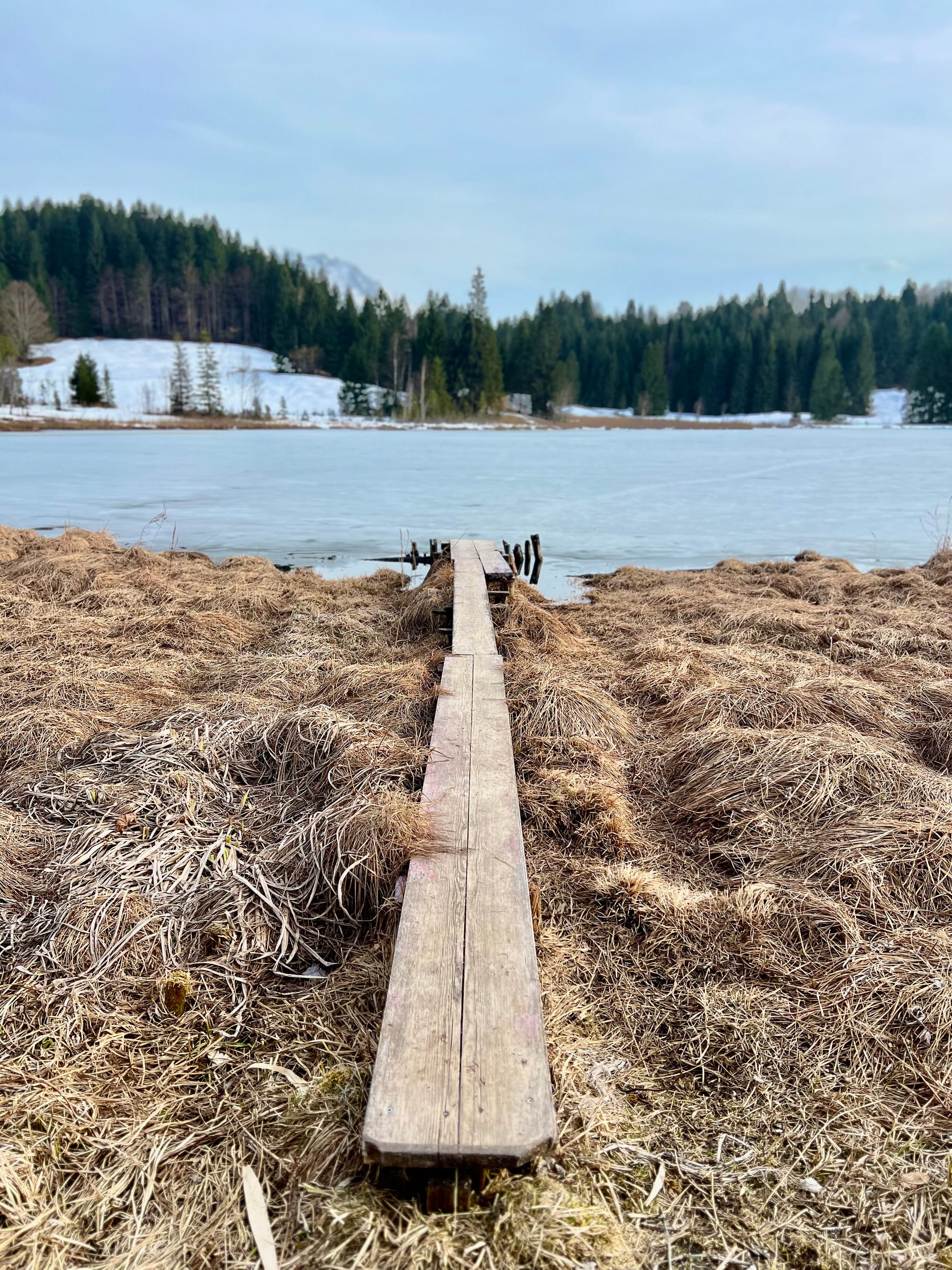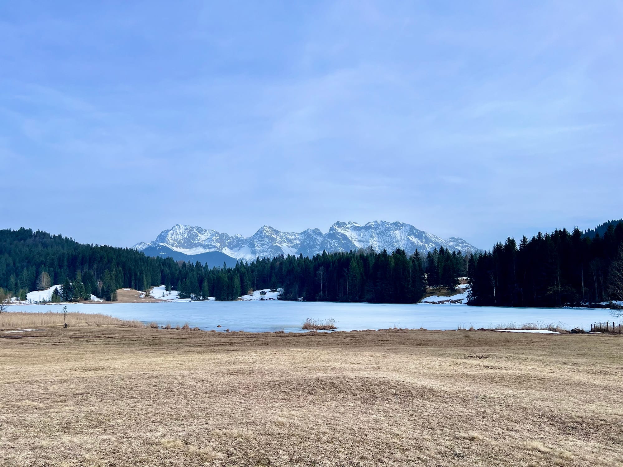 Internet mnie oszukał i zapewnił, że na alpejskich łąkach już kwitną krokusy. Pojechaliśmy w okolice Krün na spacer dookoła trzech jezior. Były pierwsze kwiatki, było słońce i śnieg, i nawet rzymska droga była, ale ani jednego krokusa. Ale i tak warto było, bo to spacer po płaskim z widokami wysokogórskimi.