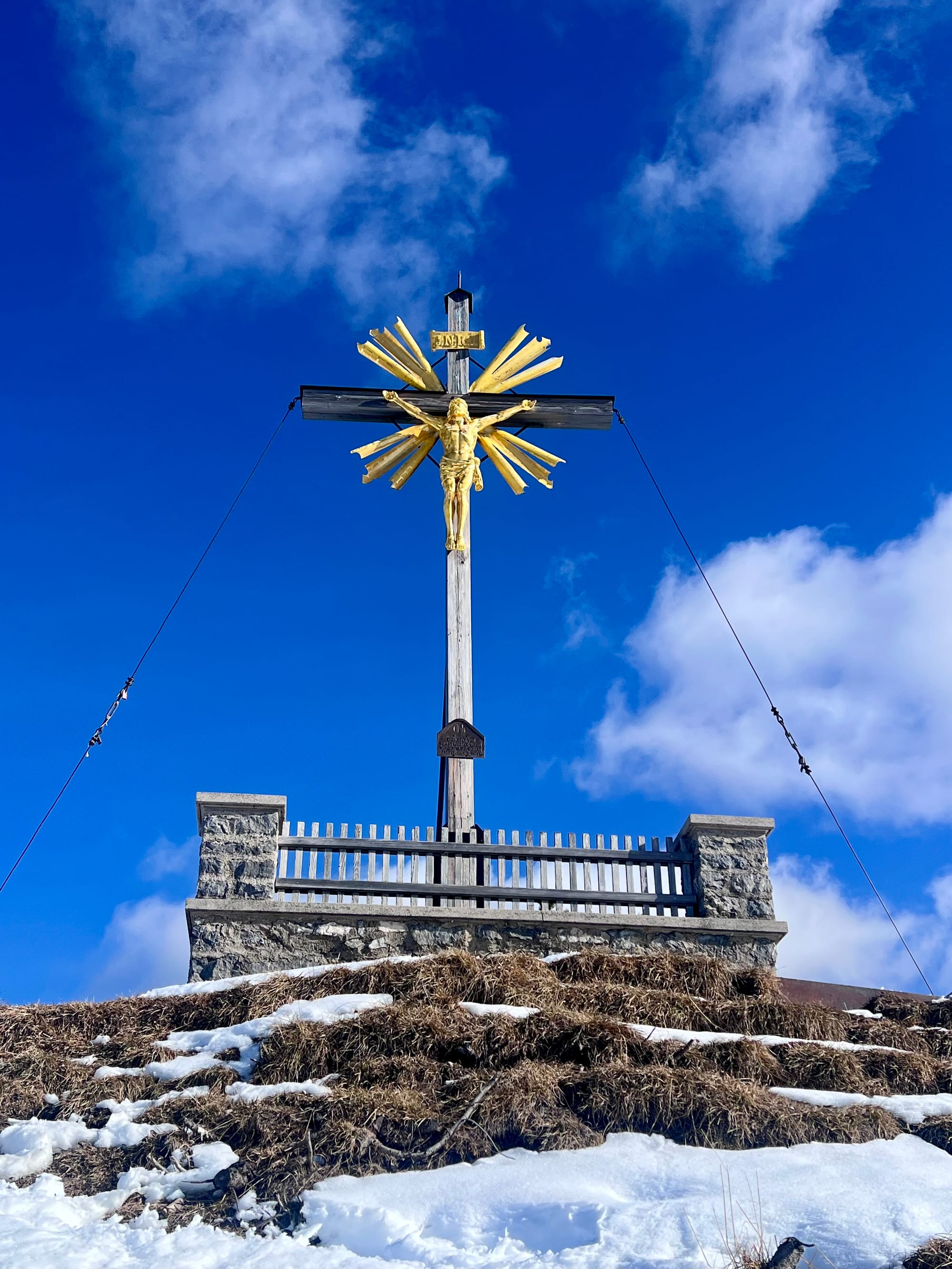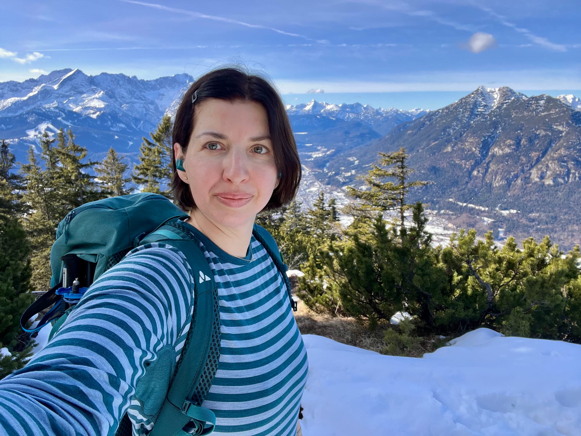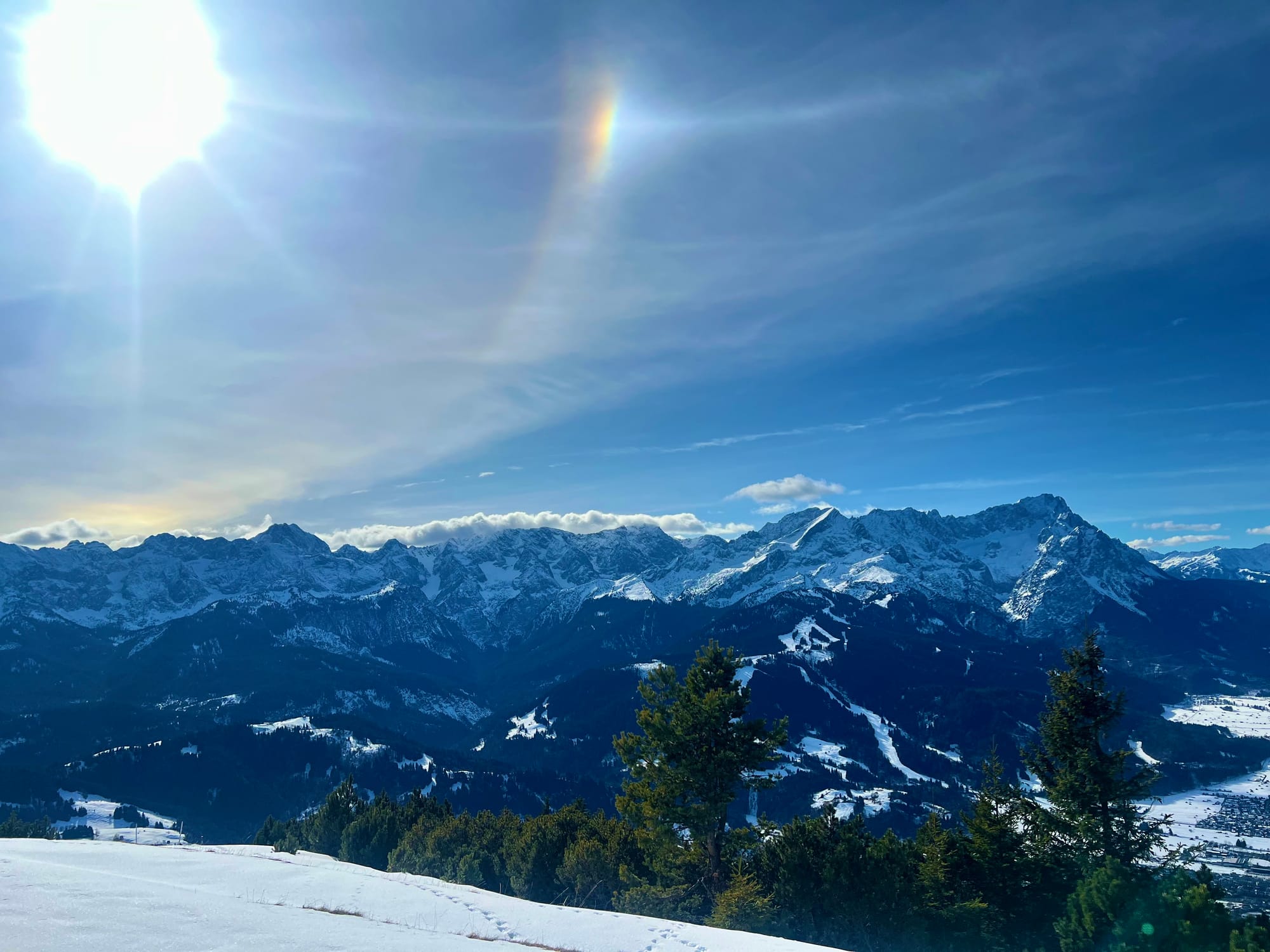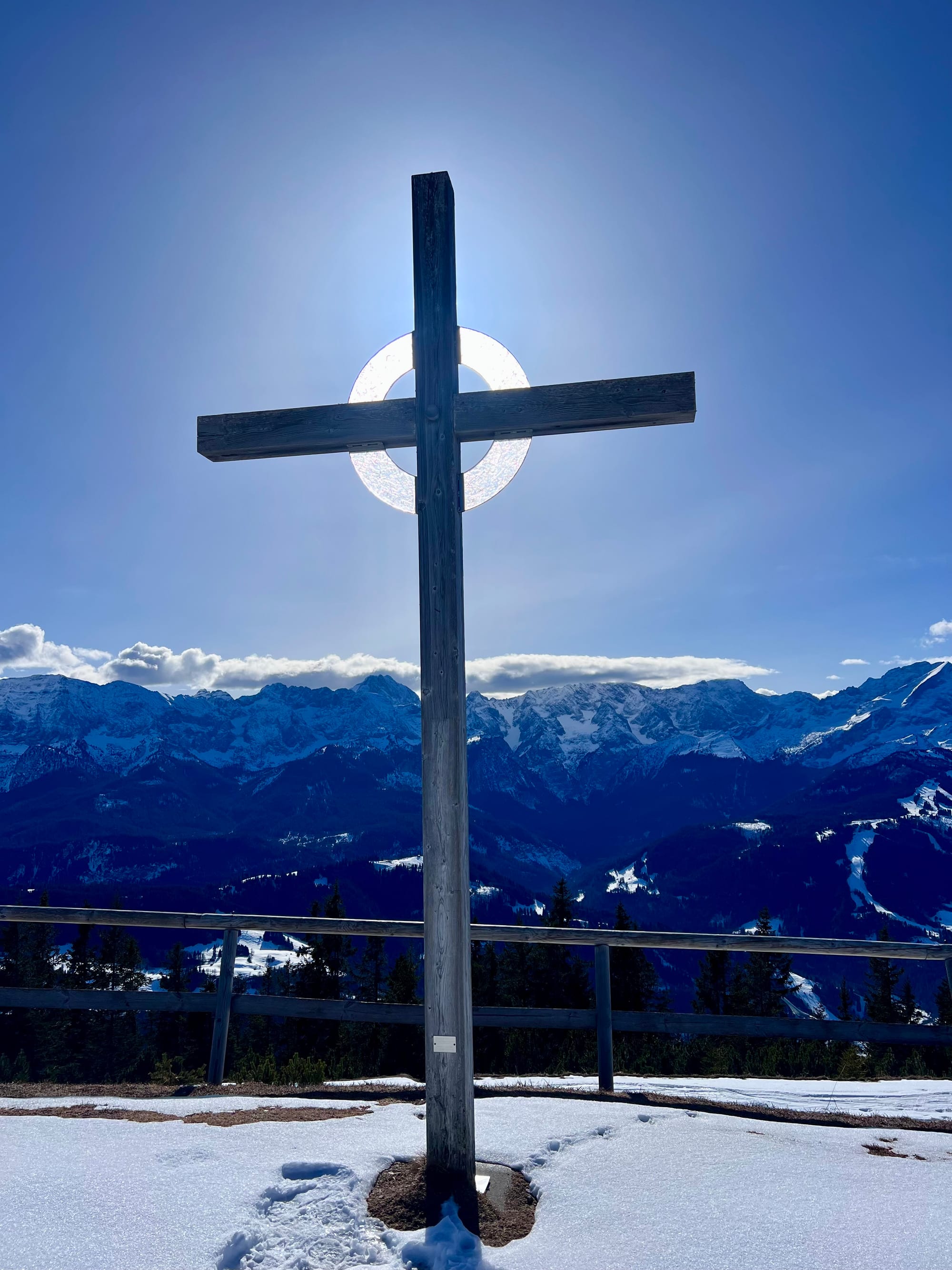 Było tak, jak zapowiadali: rano mżawka na pierwszym podejściu sam lód, no koniec świata. Ale im wyżej wychodziłam, tym lepsza pogoda się robiła. W końcu wyszło słońce! Podejście długie i strome, ale widoki na pierwszym szczycie (Eckenberg) były tego warte. Przeszłam dalej na Wank i tam zrobiłam dłuższy prostuj z grochówka z termosika. Najlepsza część: na górze był jeden facet tylko, ale akurat szykował się do zejścia. Cała góra dla mnie 😀 a wokol słońca pojawiła się tęcza!