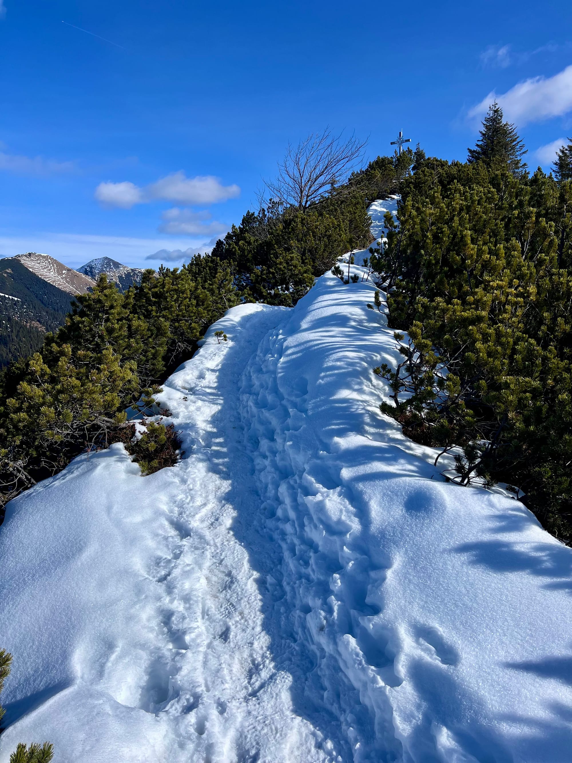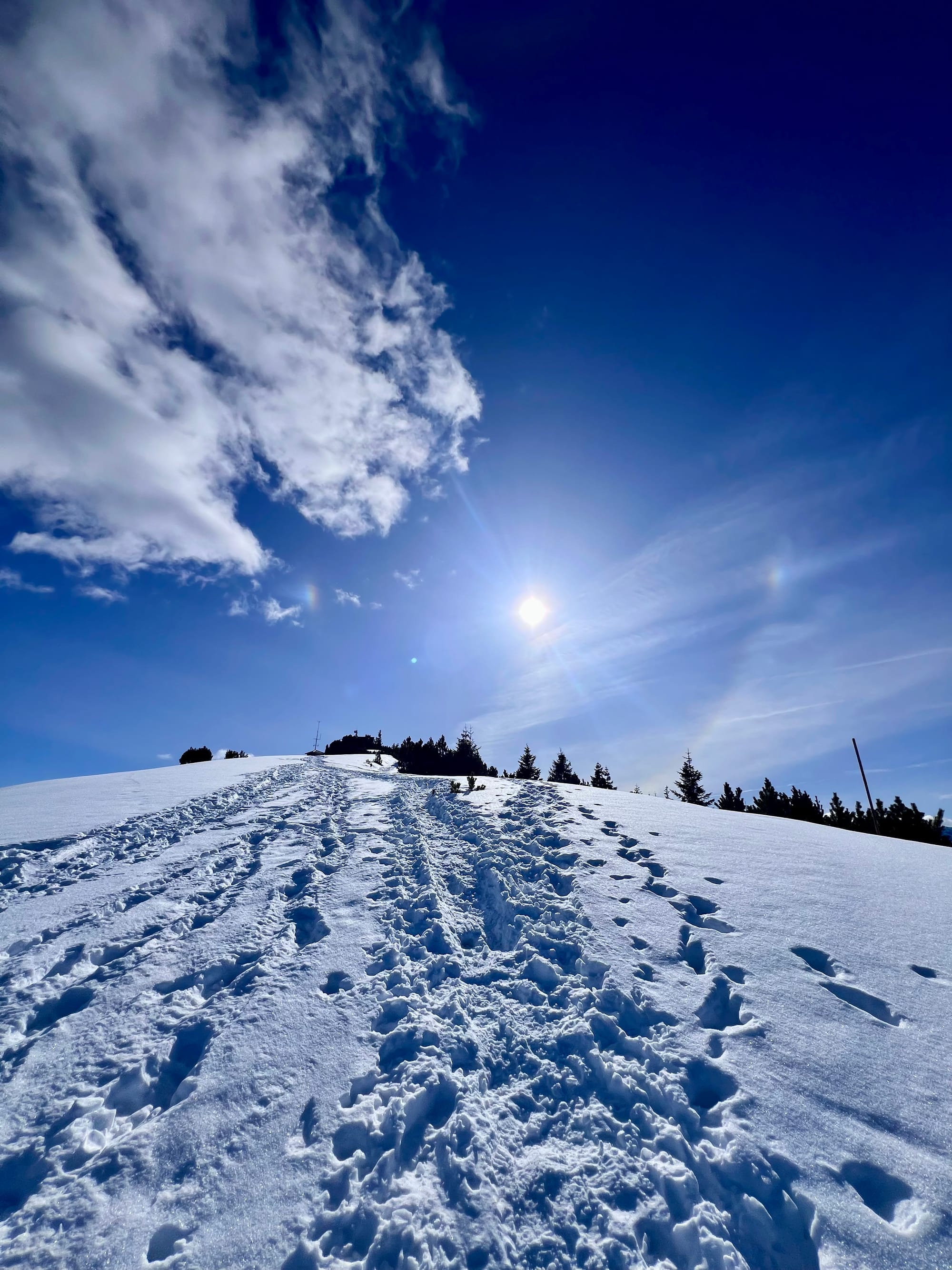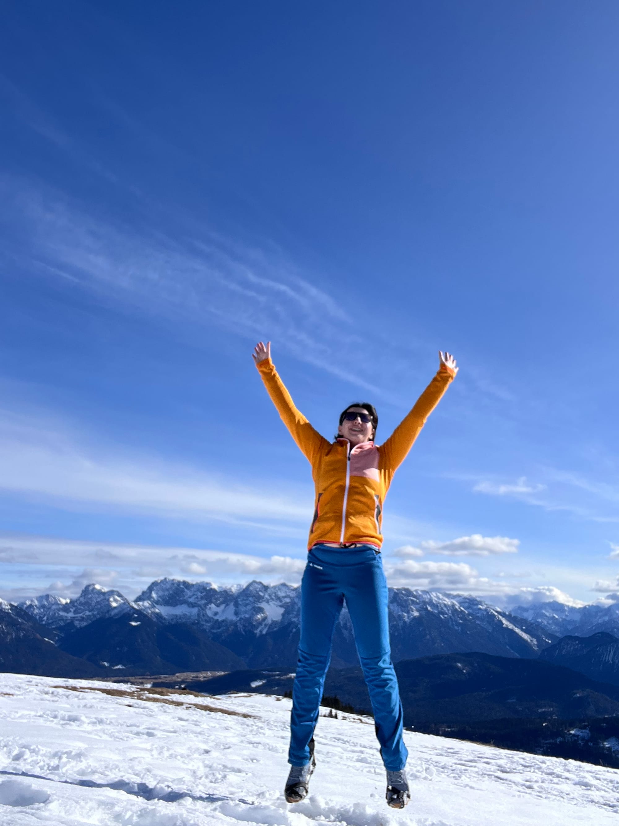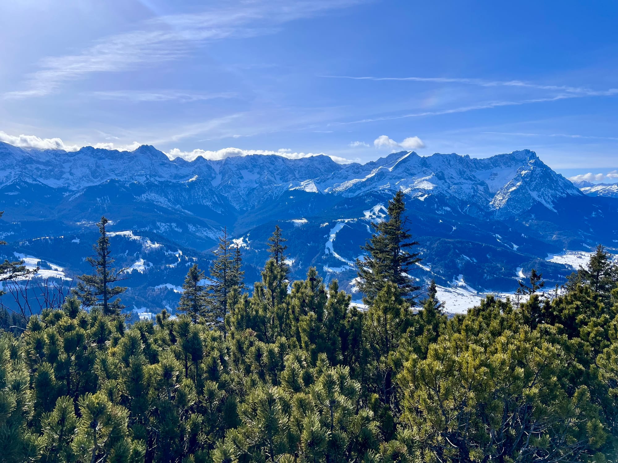 Było tak, jak zapowiadali: rano mżawka na pierwszym podejściu sam lód, no koniec świata. Ale im wyżej wychodziłam, tym lepsza pogoda się robiła. W końcu wyszło słońce! Podejście długie i strome, ale widoki na pierwszym szczycie (Eckenberg) były tego warte. Przeszłam dalej na Wank i tam zrobiłam dłuższy prostuj z grochówka z termosika. Najlepsza część: na górze był jeden facet tylko, ale akurat szykował się do zejścia. Cała góra dla mnie 😀 a wokol słońca pojawiła się tęcza!